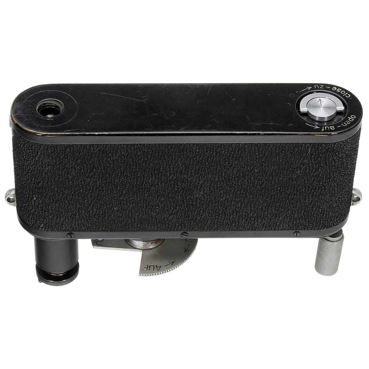Leitz, Wetzlar. No. 411331. Surface roughness measuring instrument after Forster, manual shutter (open/ close), for continuous electric motor drive. Surface changes are registered in contrast curves on the film. - Special model for industrial applications. - Literature: James Lager, "Leica", volume 1, p. 67. - Typical sharkskin vulcanite of the era. Beautiful condition. Extremely rare!