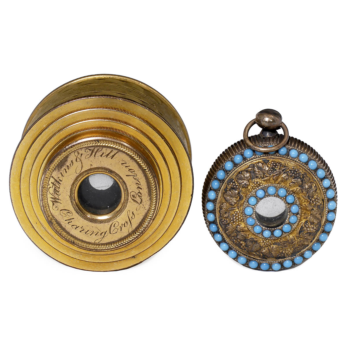1) France, c. 1820, telescope pendant, gold-plated silver, 5 draws, eyecups dewrated with raised vines between 2 rows of turquoises, Ø 1 3/10 in., extended length 1 3/5 in., in original red leather-covered case. - See: Il Museo Dell'Occhiale, Belluno, Italy and Musée de la Lunette, Morez, France. - And: 2) England, c. 1840, brass, 6 draws, eyecup signed "Watkins & Hill, Charing Cross, London", guilloché body, Ø 1 ¾ in., extended length 3 3/4 in.