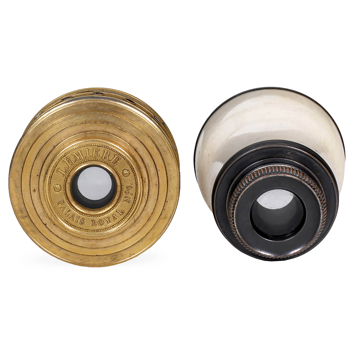 1) Marked on eyecup "Lemiere - Palais Royal No. 6", 5 extensions, gilt-brass, body decorated with 1 line of ruby-colored stones between 2 lines of mother-of-pearl, Ø 1 ¾ in., extended length 3 2/5 in., front lens with small chip, France, c. 1840. - And: 2) Single-draw telescope, nickel-silver, bone body, Ø 1 ½ in., extended length 2 ¾ in., probably France, c. 1850. - See: Musée de la Lunette, Morez, France.