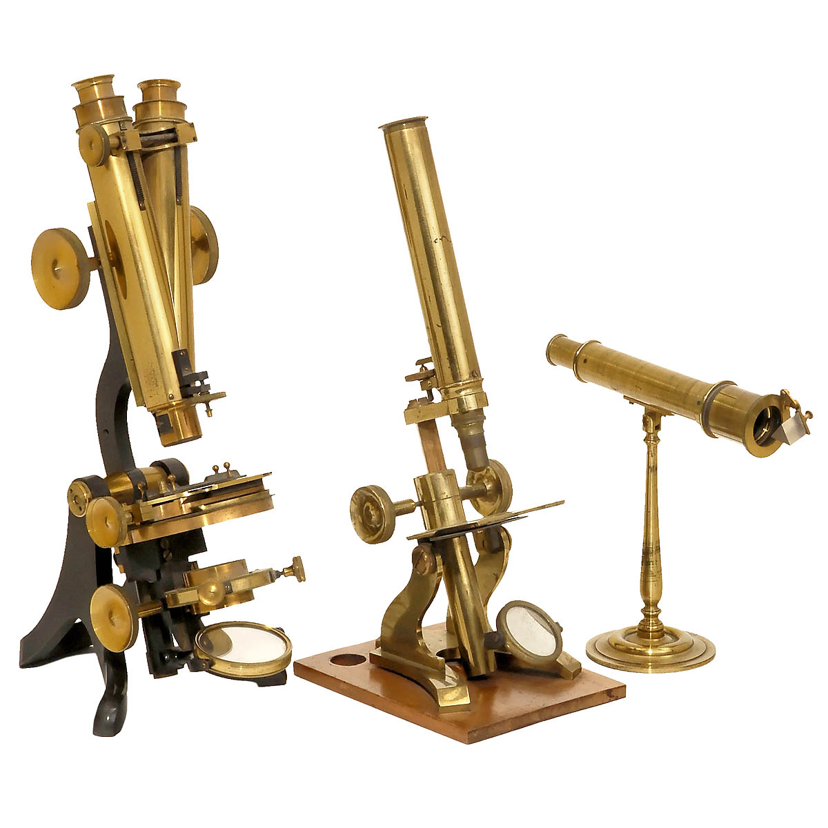 1) Binocular microscope by Henry Crouch, London, c. 1885. No. 3761, no objective lens, lacquered, height 15 in. - And: 2) Unmarked, original lacquered brass, on wood plate, tilting stand, substage disc of revolving diaphragms, rack-and-pinion coarse adjustment, body tube with milled-head fine adjustment screws into the arm, 1 ocular, 1 objective, with live box, instrument height 14 ½ in., c. 1860. - In addition: Small telescope with prism attachment, stand signed: "Elliott Bros., London", 8 in. high. - Condenser with double mirror.