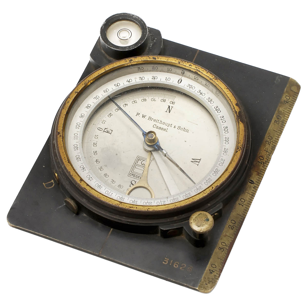 Signed on the silvered compass scale: "F.W. Breithaupt & Sohn, Cassel", no. 31623, oxidized brass, with pendulum inclinometer and circular bubble-level, Ø 3 in., base 3 1/6 x 4 in.