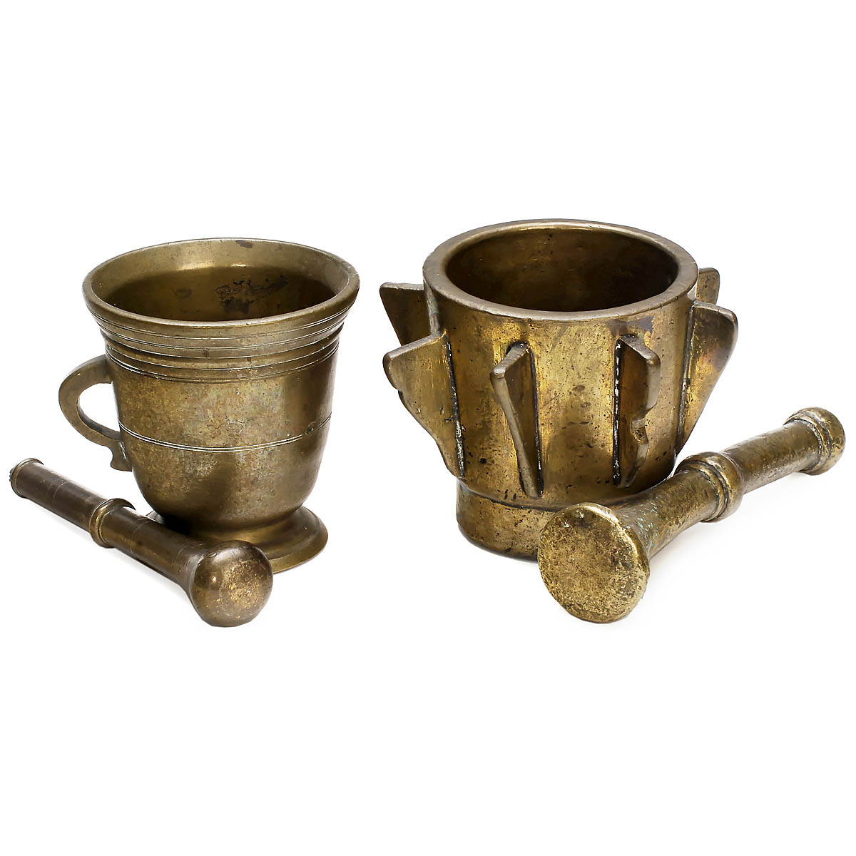 Both with pestle. 1) Mortar with handle, height 4 1/3 in., c. 1800. - And: 2) Ribbed mortar, height 4 ½ in., c. 1700.