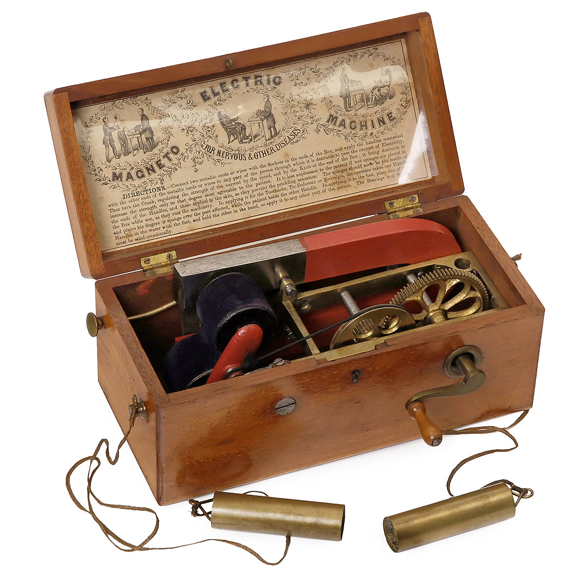 1)"Magneto Electric Machine", used to create stimulating currents, complete in walnut case, working. - And: 2) Pharmacist's press, cast-iron, with spindle, ceramic container, height 11 ¾ in.