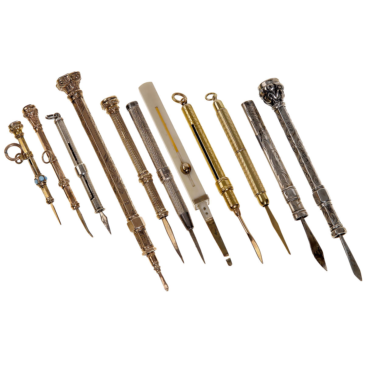1) Maker "S. Mordan & Co.", inventor "T.C. Palmer", gold and bone. - 2) Tip 14 k red gold, body 18 k yellow gold. - 3) For rotating, tip 14 k red gold, body 18 k yellow gold. - 4) Finely engraved by hand, terminal in form of a capital decorated with swags, foliage and a mounted vacant seal, inlaid green stones, tip 8 k red gold, silver-gilt body. - 5) Silver, engraved, hallmarked with F.W., anchor, lion and T. - 6) Finely engraved by hand, terminal in form of a capital, mounted vacant seal, hallmarked F.W., anchor, lion and D. - 7) 22 k silver, hallmarked, engine-turned body. - 8) Gilt, slider defective. - 9) 8 k gold tip, gilt body. - 10) Silver, engine-turned, hallmarked with anchor and lion. - And: 11) Gilt, terminal in form of a capital, mounted vacant seal.