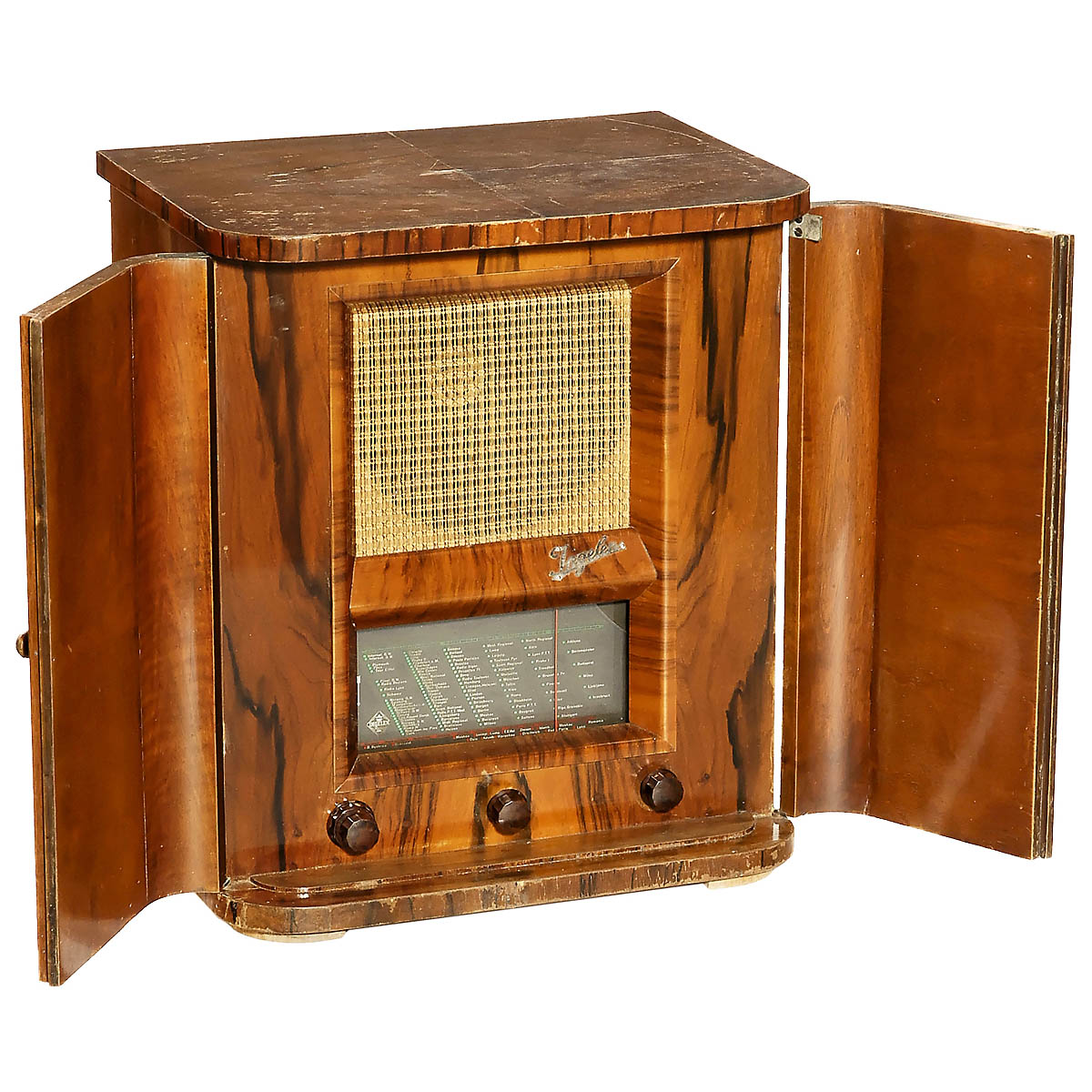 Elektrotechnische Fabrik Ludwig Neumann, Vienna. 5 valves, LW, MW and SW, alternating current 110-220 V, wood case with double doors, complete.