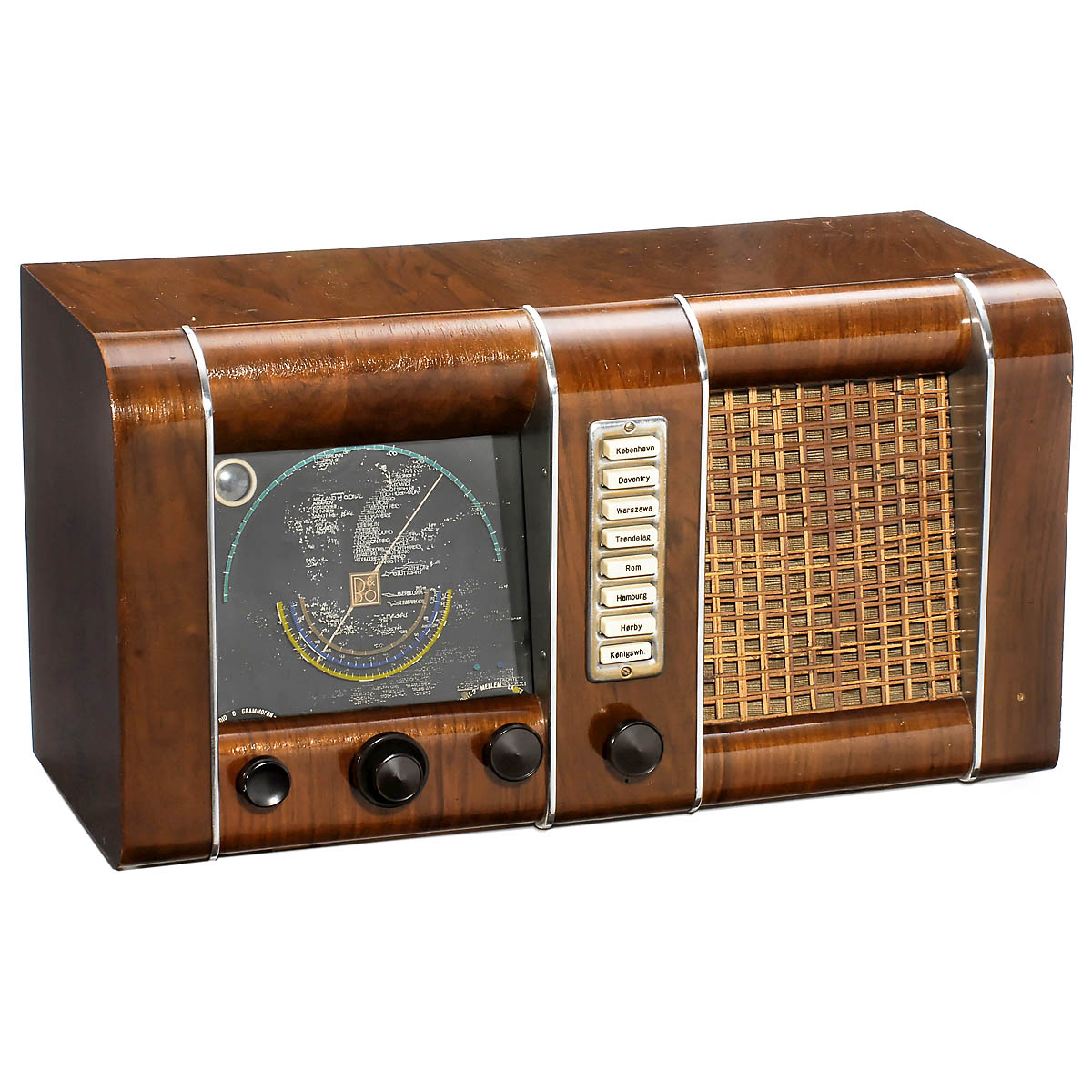 Bang & Olufsen, Denmark. 6-valve radio receiver, wood body, 8 push-button station selectors, complete, slight flaking on scale.