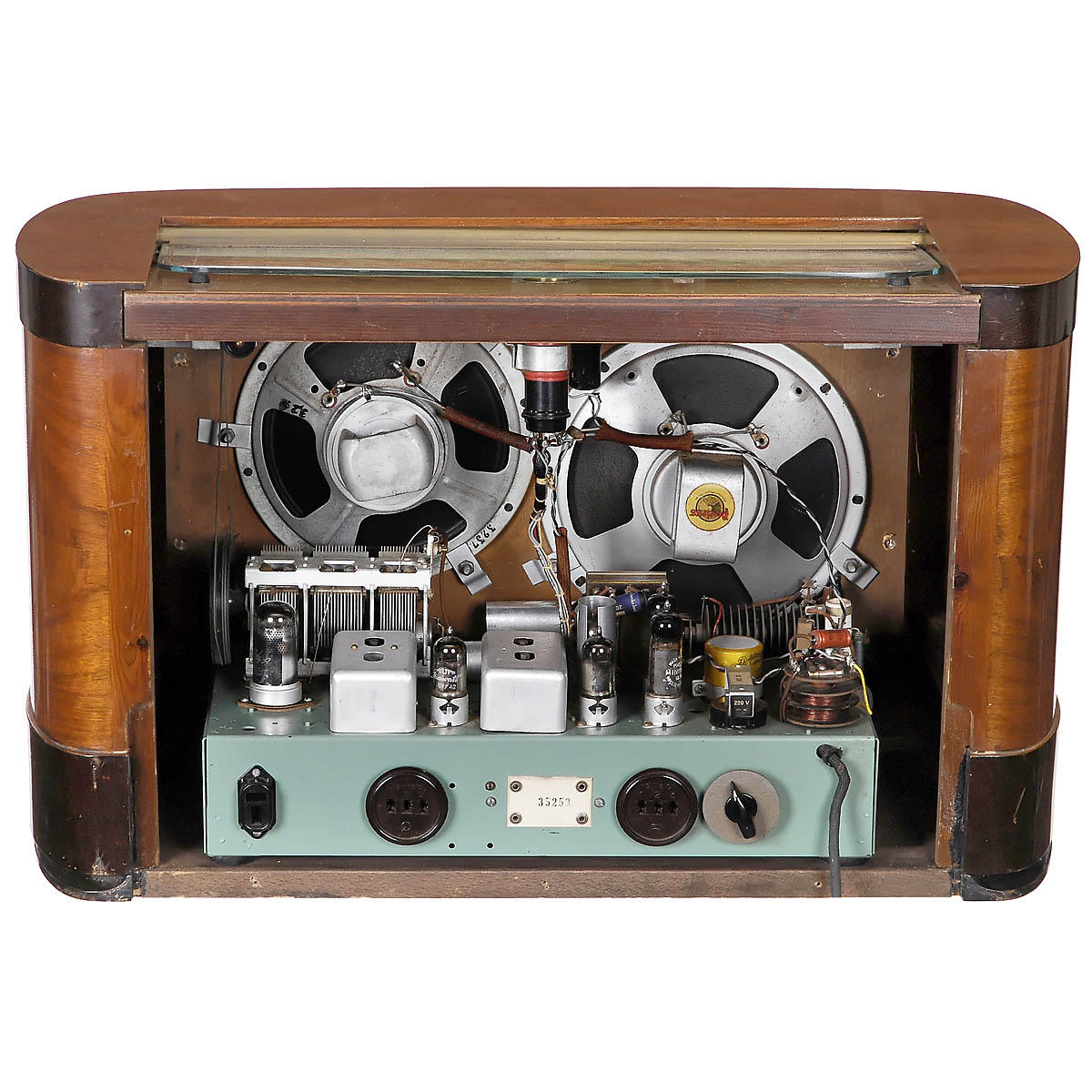 Manufactured by Linnet & Laursen, Denmark. Wood case, folding glass scale, magic eye in lid, 7 tubes, complete, good original condition, rare!