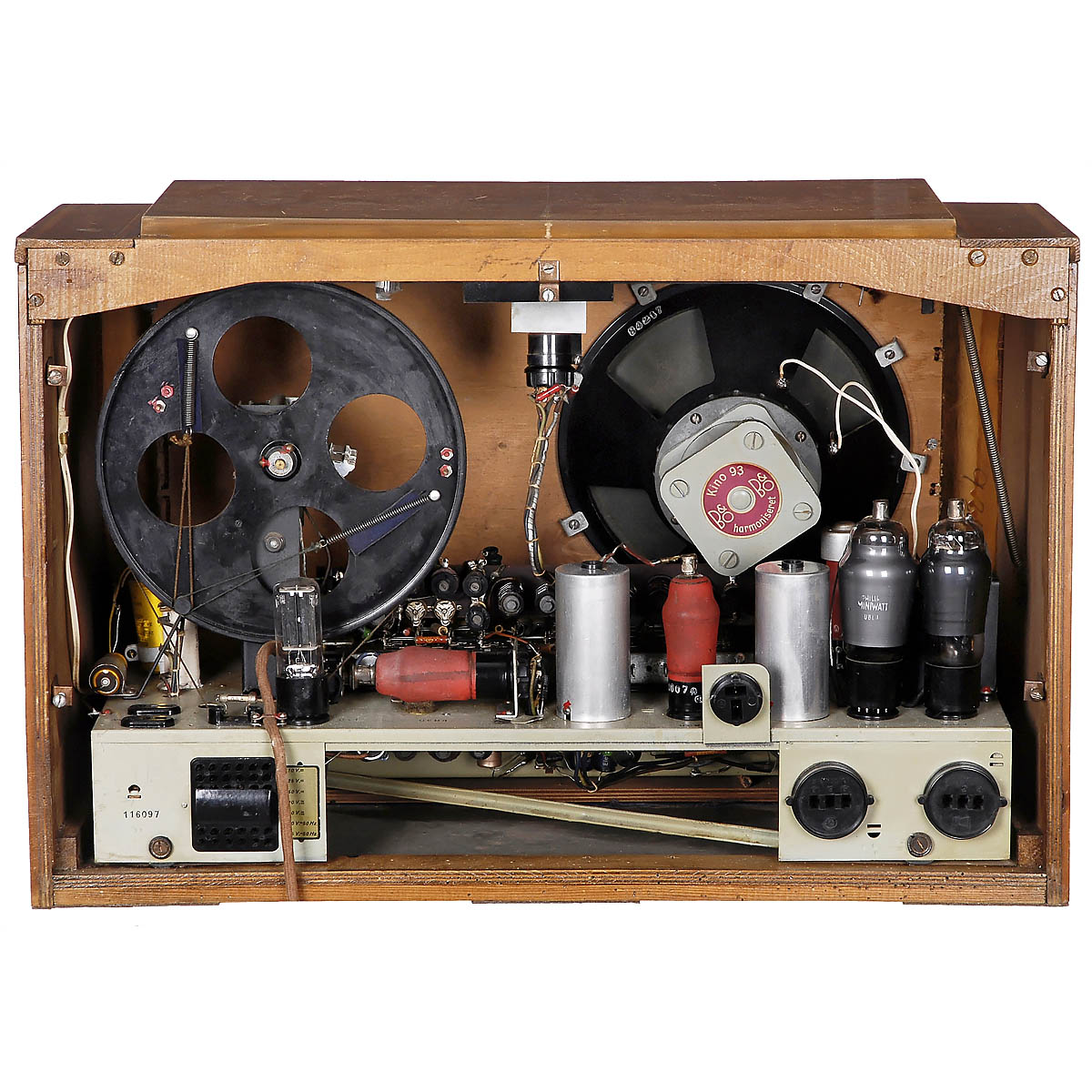Bang & Olufsen, Denmark. 7-tube radio receiver, folding scale, magic eye, wood case, complete, good original condition, rare!