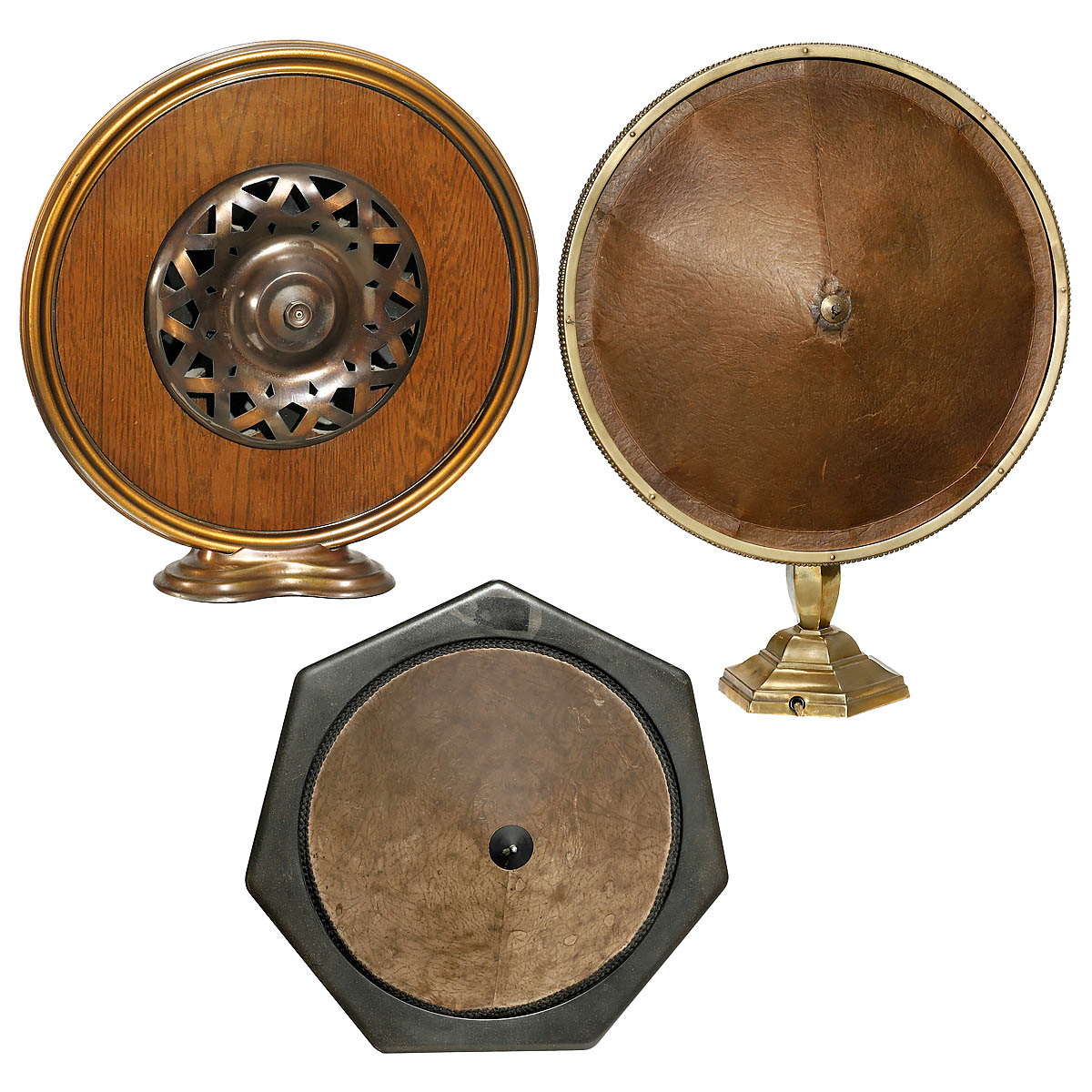 1) Gecophone Cone, model BC 1650, General Electric London, heavy brass base, height 21 ¼ in., Ø 16 1/6 in. - 2) Philips wall speaker, bakelite, paper diaphragm. - And: 3) Sterling, model 75, wood and brass, paper diaphragm.