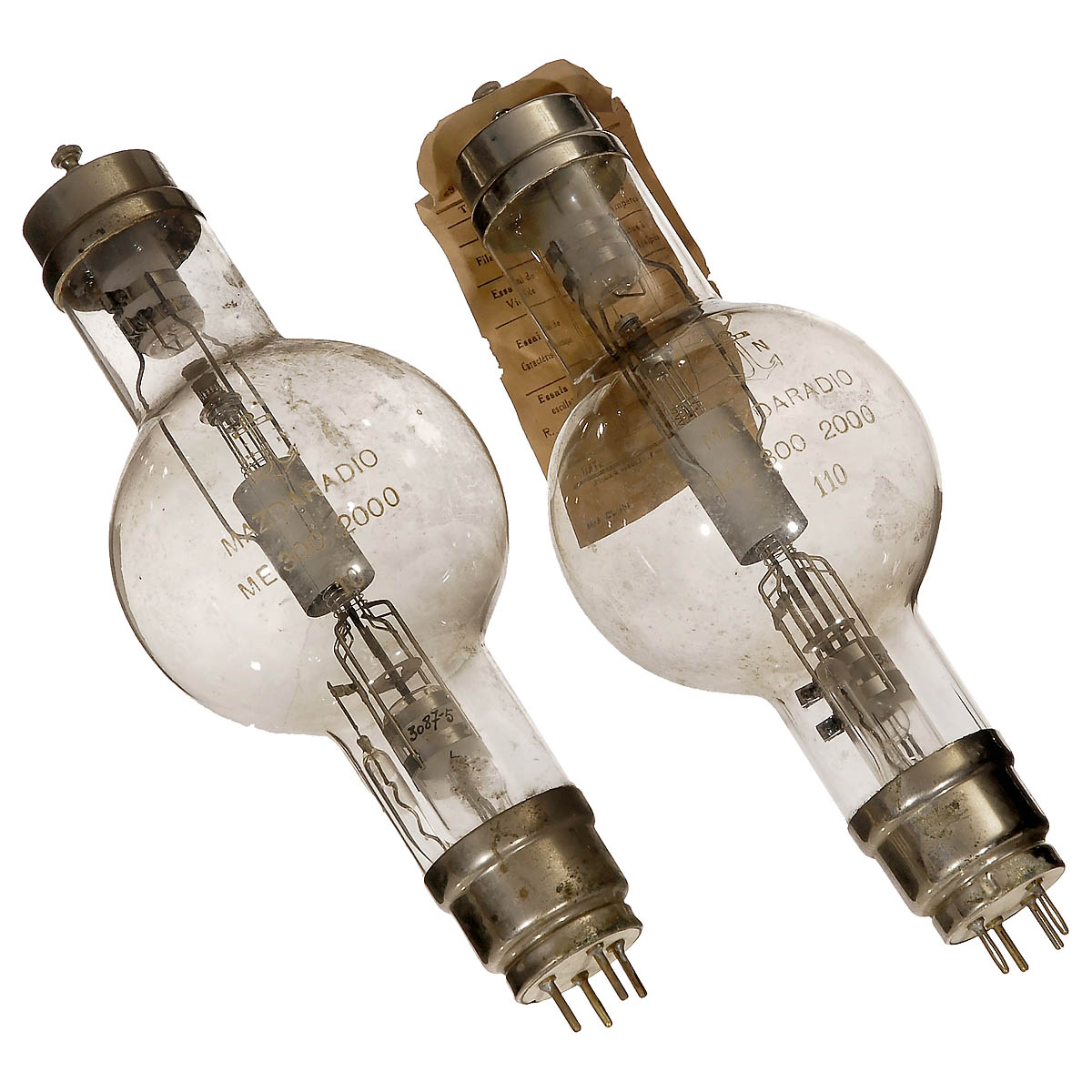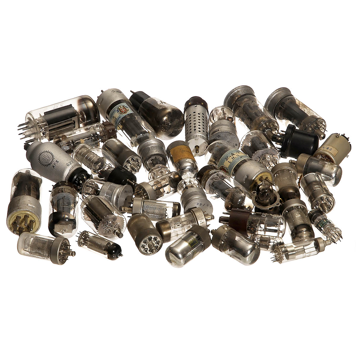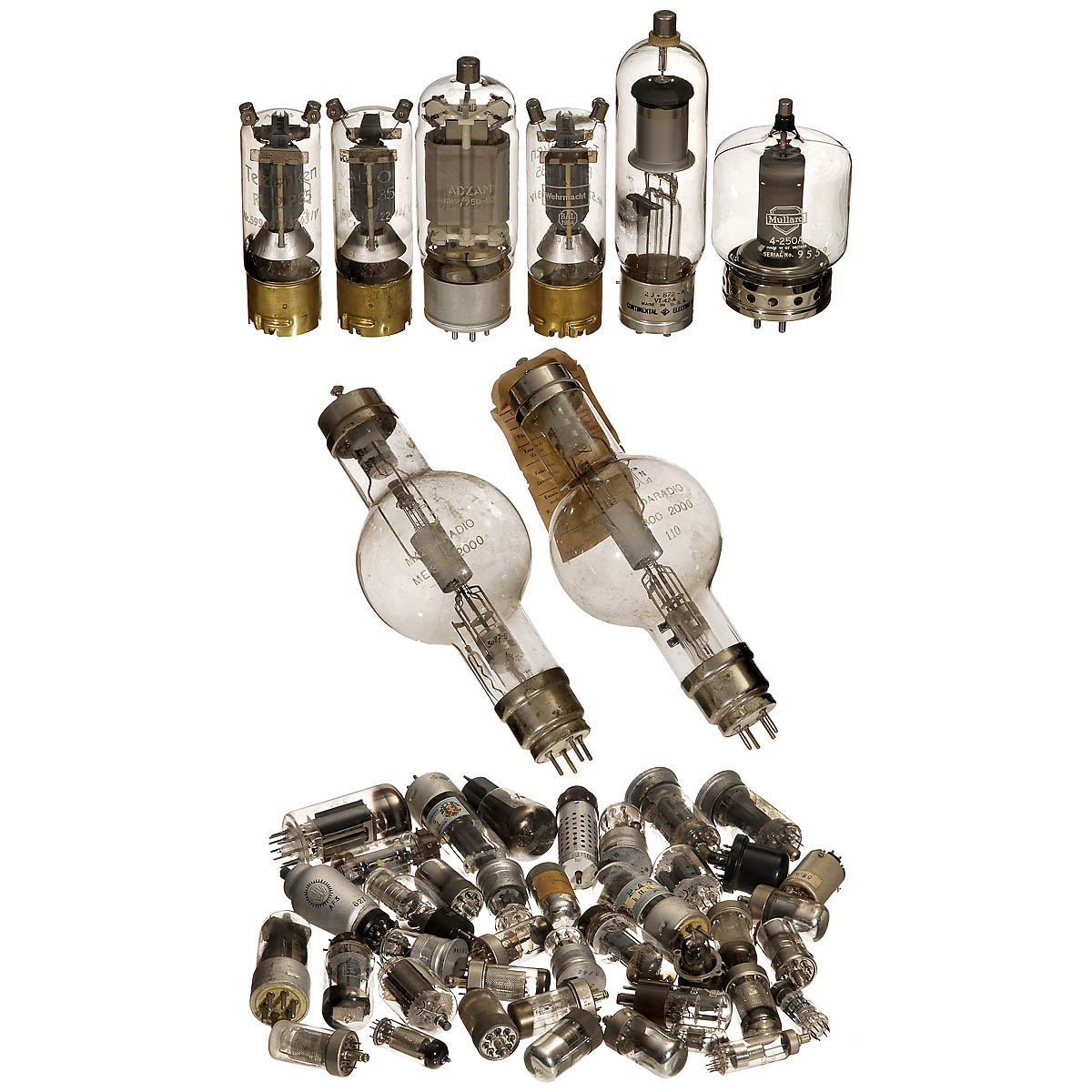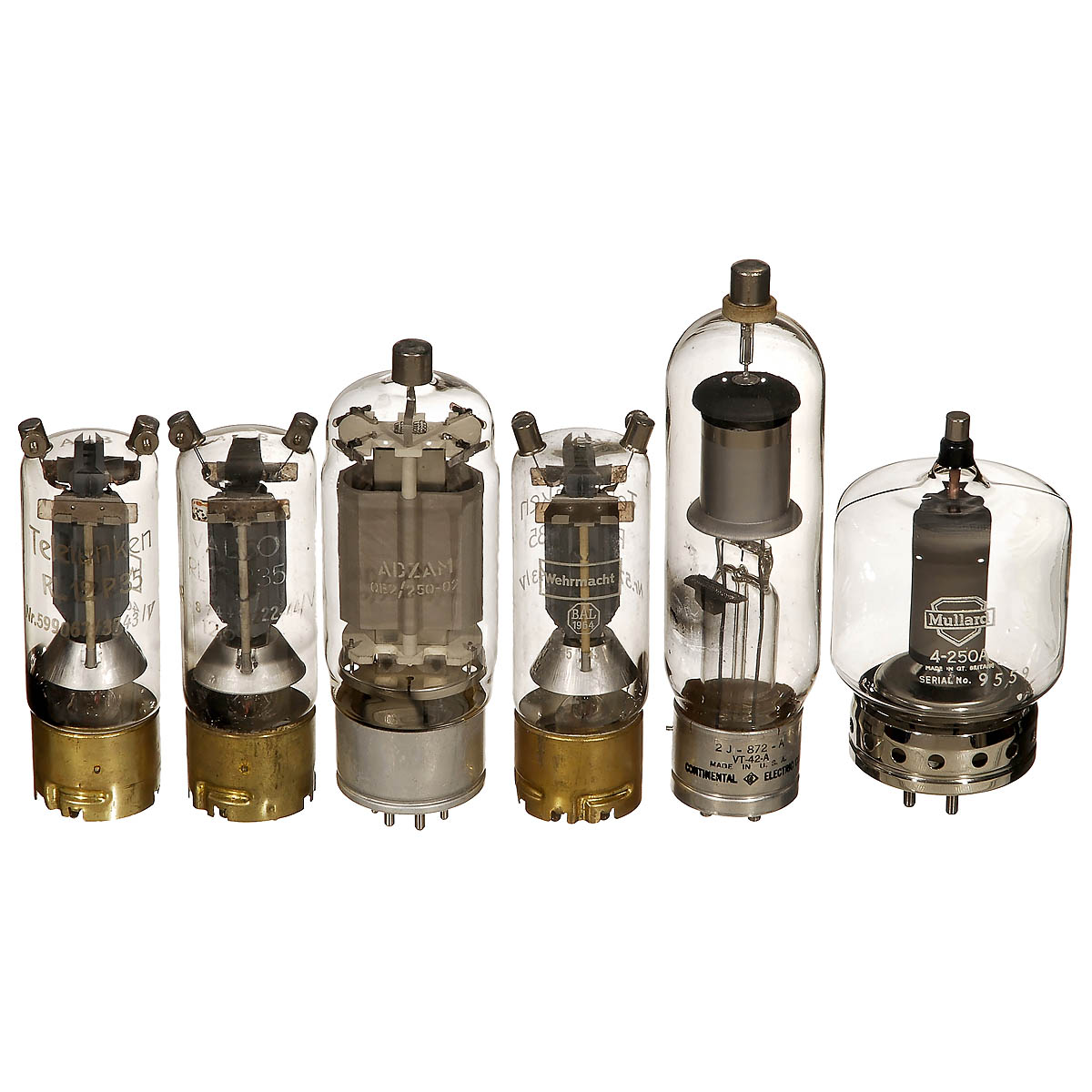 Mullard 4-250A, transmitting tube. - 2 x Mazdaradio ME300 2000. - Adzam QE2/250-02. - 3 x Stabilovolt H85-255/60, barretter. - 2 x Fivre 6T. - Fivre 6TG. - 2 x Telefunken RL12P35, transmitting tube. - Continental Electric 2J-872-A. - Valvo RL12P35, transmitting tube. - RCA SC189A. - Telefunken RL12P10. - Siemens RS1003. - Fivre 807. - 3 x Valvo RL12P10, pentode. - 2 x Telefunken LS50, pentode. - Telefunken RE034, triode. - Telefunken RV 12P 4000, pentode. - 3 x Siemens LD2. - And 28 further tubes.
