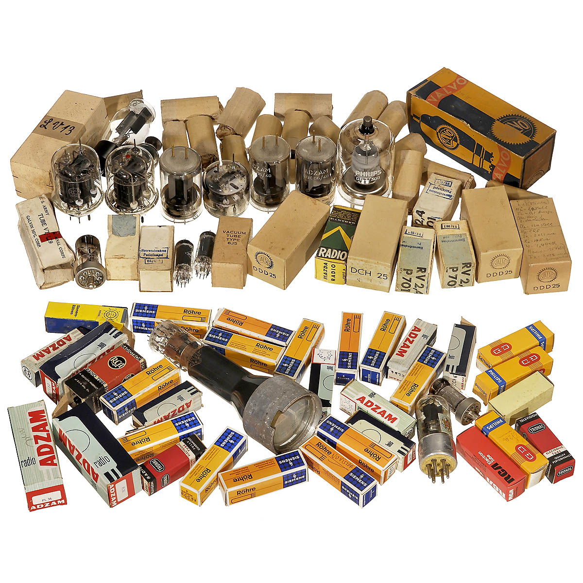 Standard Telephones and Cables Ltd. 5B/110M. - Siemens HL2/0,5a, resistance tube. - 18 x Brimar 8D3 6AM6. - 3 x Azdam QQE 06/40, double tetrode. - Philips QQE 04/20, double tetrode. - 2 x RCA 3E29. - Philips 506, rectifier. - Valvo Ca, in box. - Telefunken LV13, triode. - 3 x Valvo DDD25, double triode. - Valvo DCH25, hexode. - 4 x Telefunken RV2,4P701, pentode, in boxes. - Telefunken RV2,4P700, pentode. - RCA 6J5. - Valvo DAC25. - Philco 1LN5. - Mazda 6L7. - Philips QB3/300, transmitter tube, in box. - Valvo DF25, pentode. - Telefunken LB2, radar picture tube. - 2 x Mazda PL36, pentode. - And 30 further tubes.