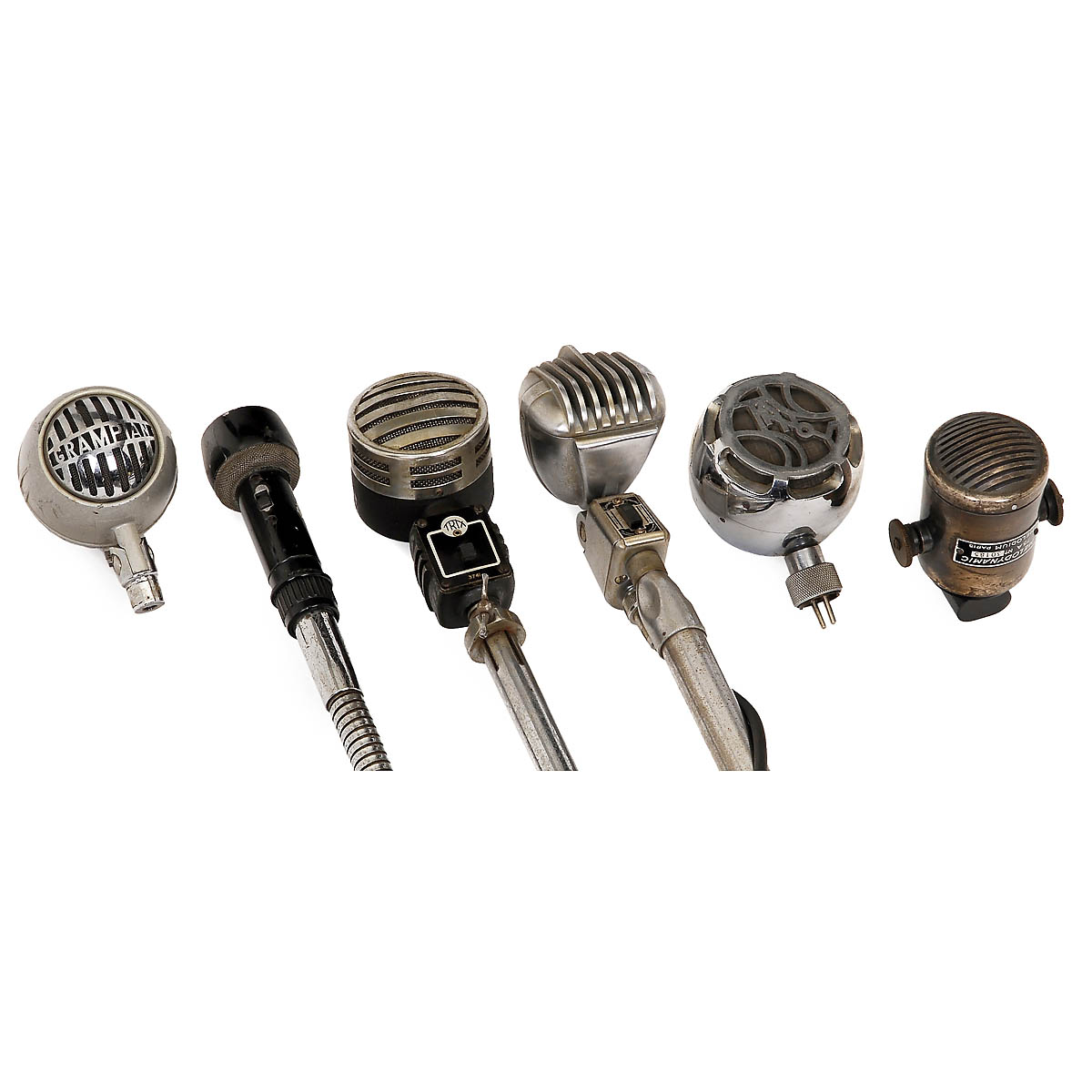 1) Turner Dynamic W33D, USA, c. 1950. - 2) Trix model 3741, London, c. 1953. - 3) Grampian DP1, England, c. 1950. - 4) Tannoy ball-type microphone, England, c. 1955. - 5) Gamma cardioid blues microphone, c. 1950. - 6) Melodynamic 75A, Paris, c. 1948. - And: 7) 10 more microphones and parts. - Not all pictured.