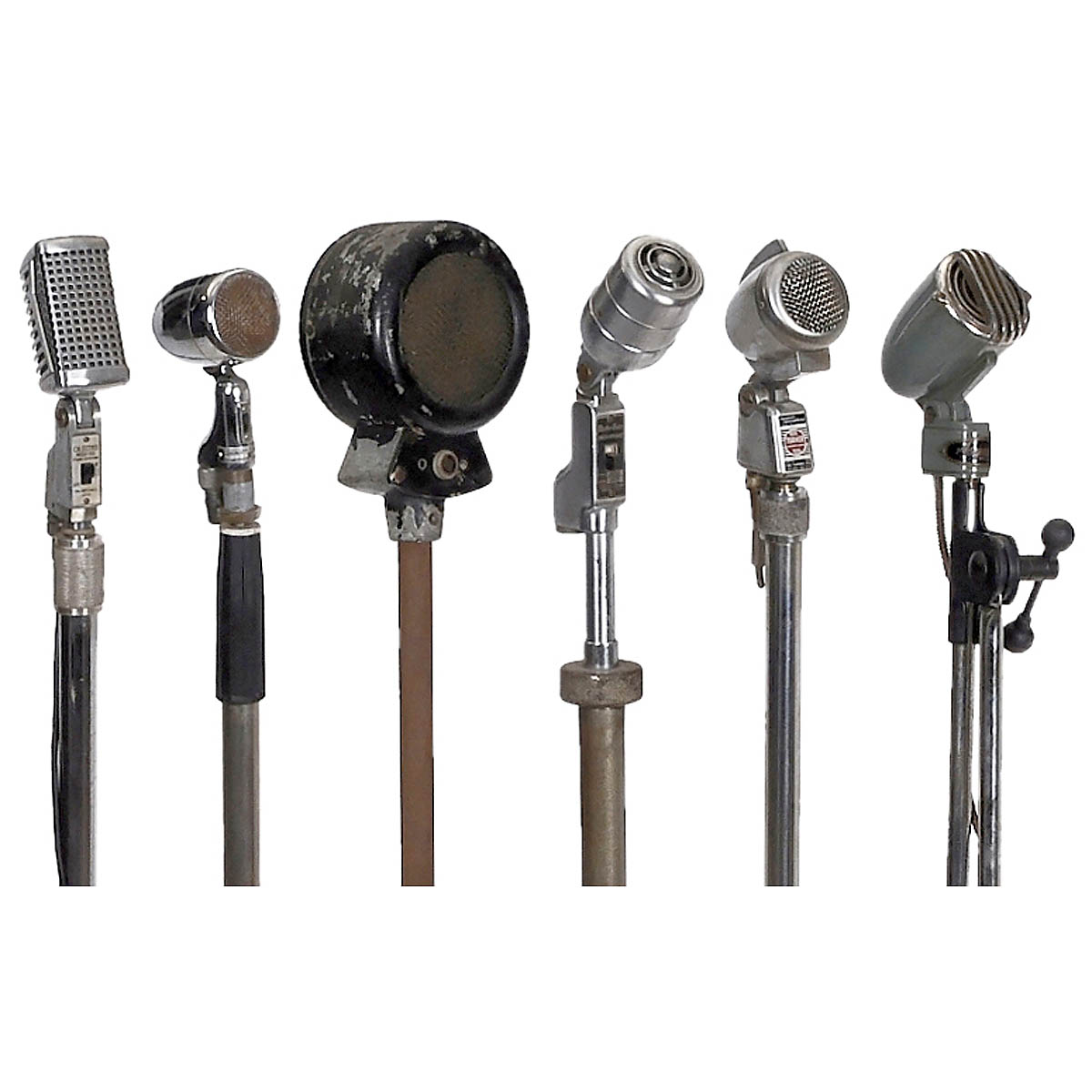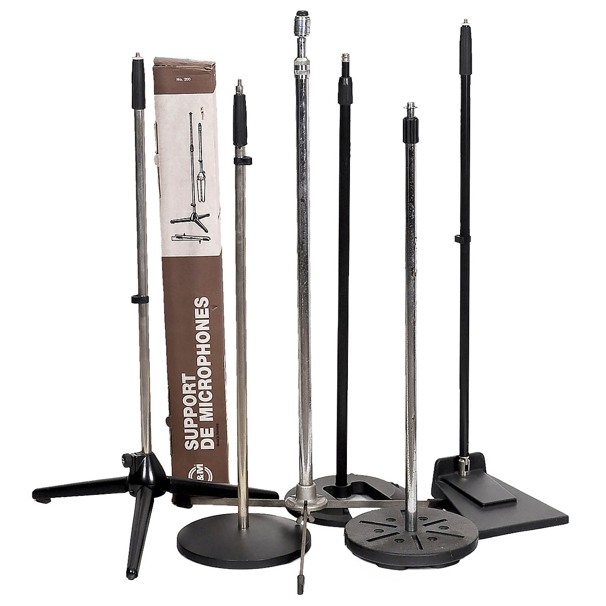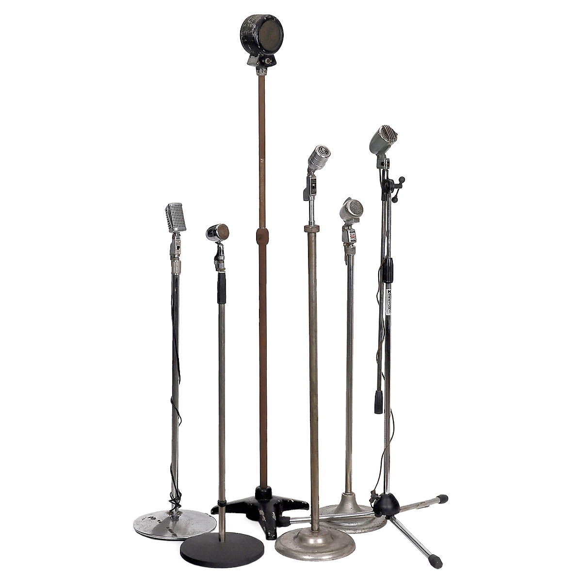 1) Ronette GS210, made in Germany. - 2) Unkown, probably England, damaged. 3) Turner Dynamic Microphone, model 220, USA. - 4) Argonne AR-54, Japan. - 5) Calectro Q4-150, Japan. - 6) Electro-Voice, model 630, USA. - And: 7) 13 various microphone stands.