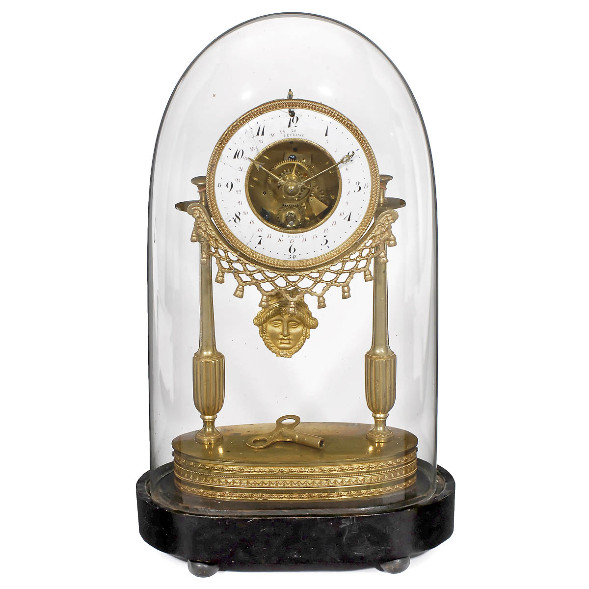 Signed "Defrance à Paris", gilt-bronze case, enamel dial, skeletonized movement, pendulum with string suspension, on ebonized wood base, under glass dome, overall height 13 ½ in., small cracks in dial, movement in working condition (not guaranteed).