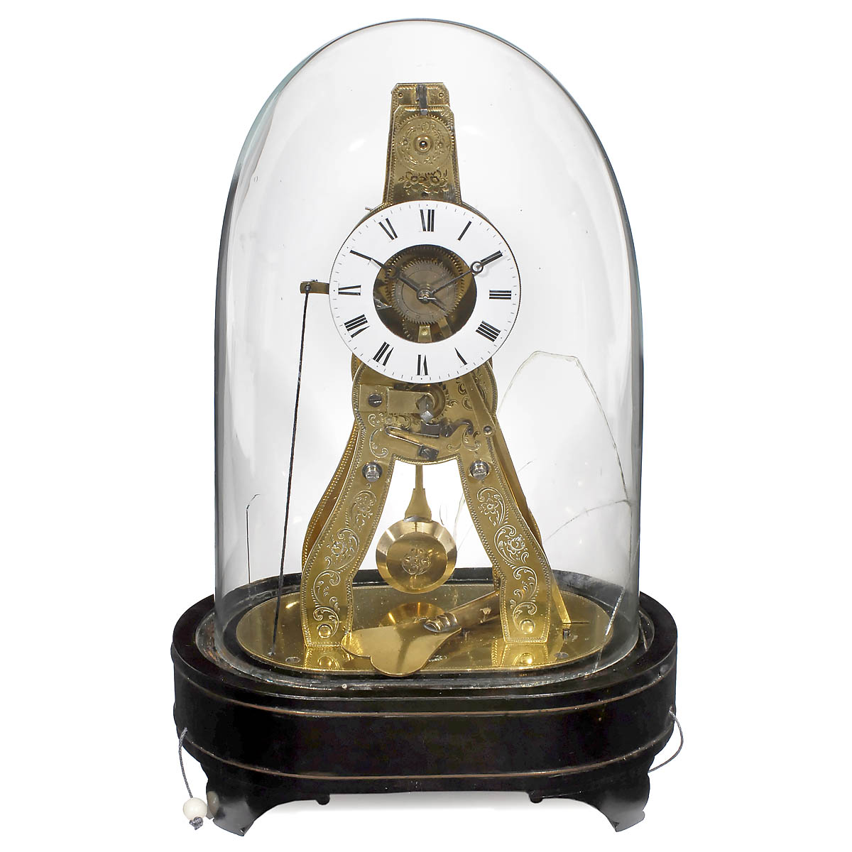 Signed "MS. Honorables, Exp., Paris - Londres", scissor-shaped brass frame with engraved front, only 6 ¾ in. high, enameled dial, engraved pendulum bob with silk suspension, with a ratchet wheel for the regulation, on ebonized oval wood base with hidden alarm mechanism, set via pull-string, alarm set with a second cord to the ratchet tooth alarm disc in the clock mechanism, with key, working, glass dome damaged.