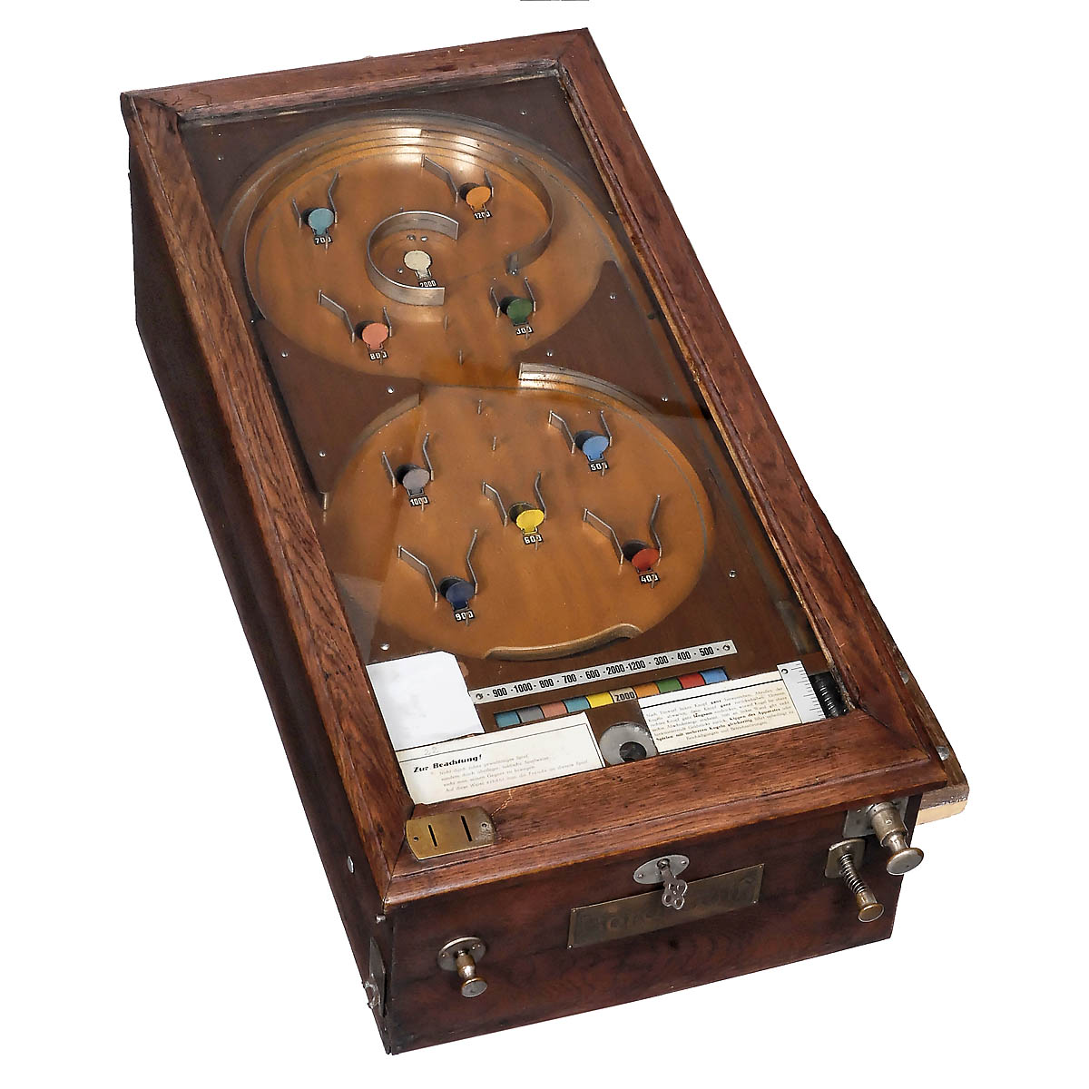 German amusement machine, manufactured by Jentzsch & Meerz, Leipzig, coin-slot for 5 or 10 pfennig. No legs. Good original working condition. Size 34 x 17 in.