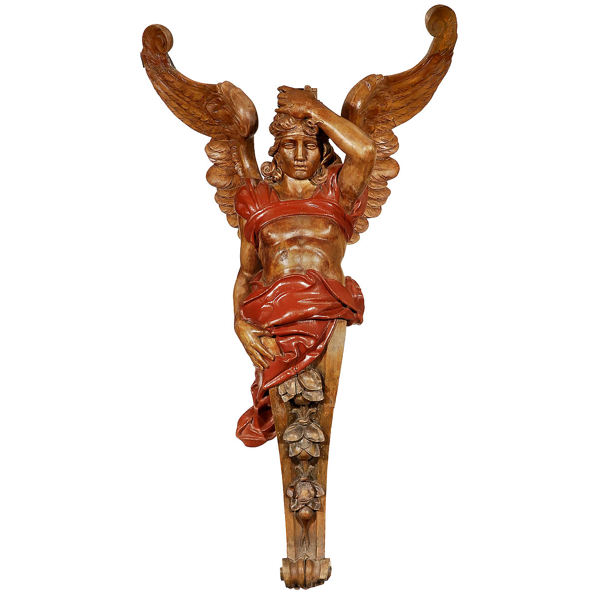 In form of an angel, finely carved wood, height 52 in. Figures of this kind were found on fairground rides and stages.