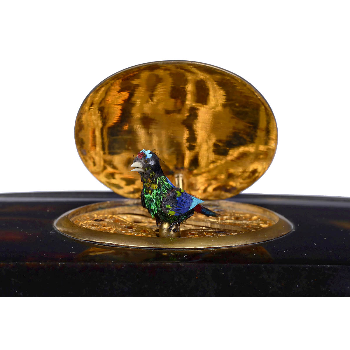 With going-barrel movement, bird with iridescent plumage, moving bone beak, wings, perch and tail, in tortoiseshell case with hinged key-compartment, engraved gilt grille and bichromate engraved lid depicting birds in flight framed by flowers, wd. 3 ¾ in.