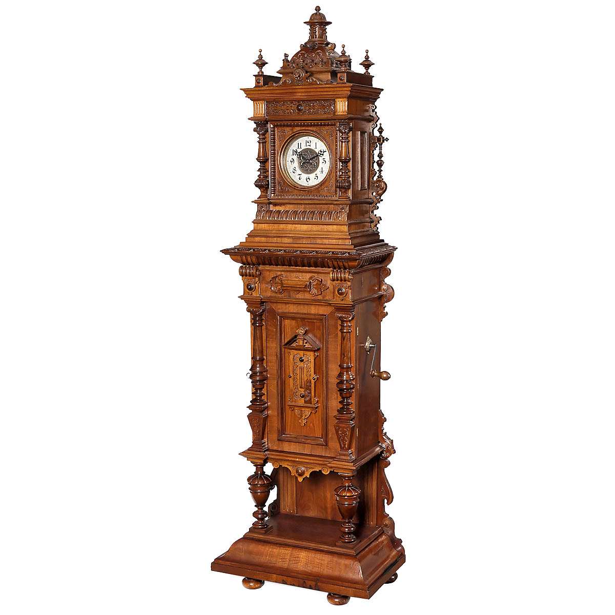 Musical movement by Symphonion Musikwerke, Leipzig. For 11 ¾ in. discs, 84 teeth in duplex comb, complete! Clock in top gallery, striking on bell and setting the music on every hour, walnut case made in Czechoslovakia 40 years ago after an original "Symphonion Hall Clock", dimensions: 23 ½ x 14 x 80 in. With 11 discs. - Good playing condition with excellent sound!