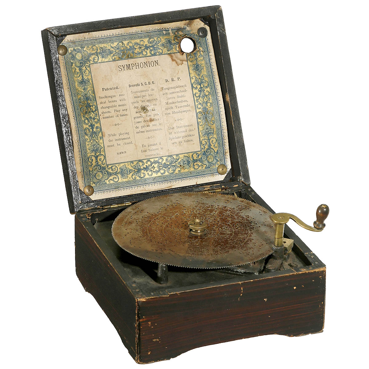 1) Polyphon Musikwerke, Leipzig. Polyphon No. 42. For 11 ¼ in. discs, 54 teeth in music comb (complete), crank added, start lever too short, case missing two internal boards, working, with 14 discs (rusty). - And: 2) Symphonion manivelle disc musical box, model no. 28, for 5¾-inch discs, 40 teeth in steel comb (10 broken), working, with crank and 1 disc.