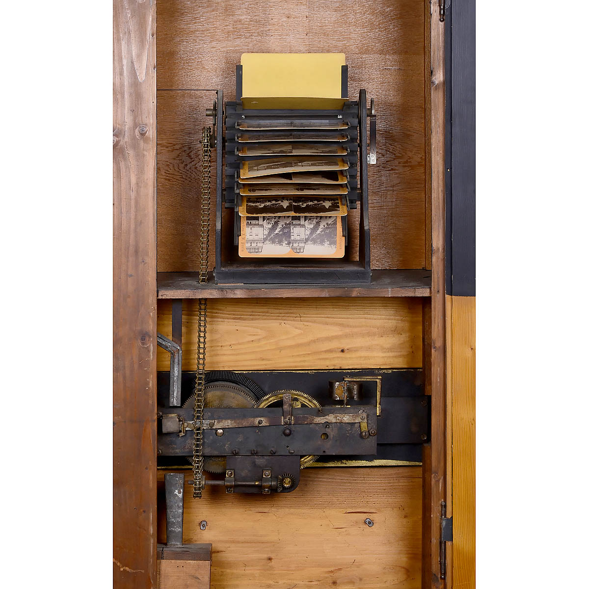 Model 505, pictured in 1898 Holzweissig catalog, p. 36. With Symphonion for 17 3/8-inch discs, 106 teeth in duplex comb (complete), 18 stereoscopic pictures in viewer (size 9 x 18 cm), chain-driven, lateral coin slot, coupled viewer and disc-player mechanism, spring-driven, walnut cabinet with balustrade, overall size 83 x 19 5/8 x 28 ¾ in. - Good working condition! No other model known to us.