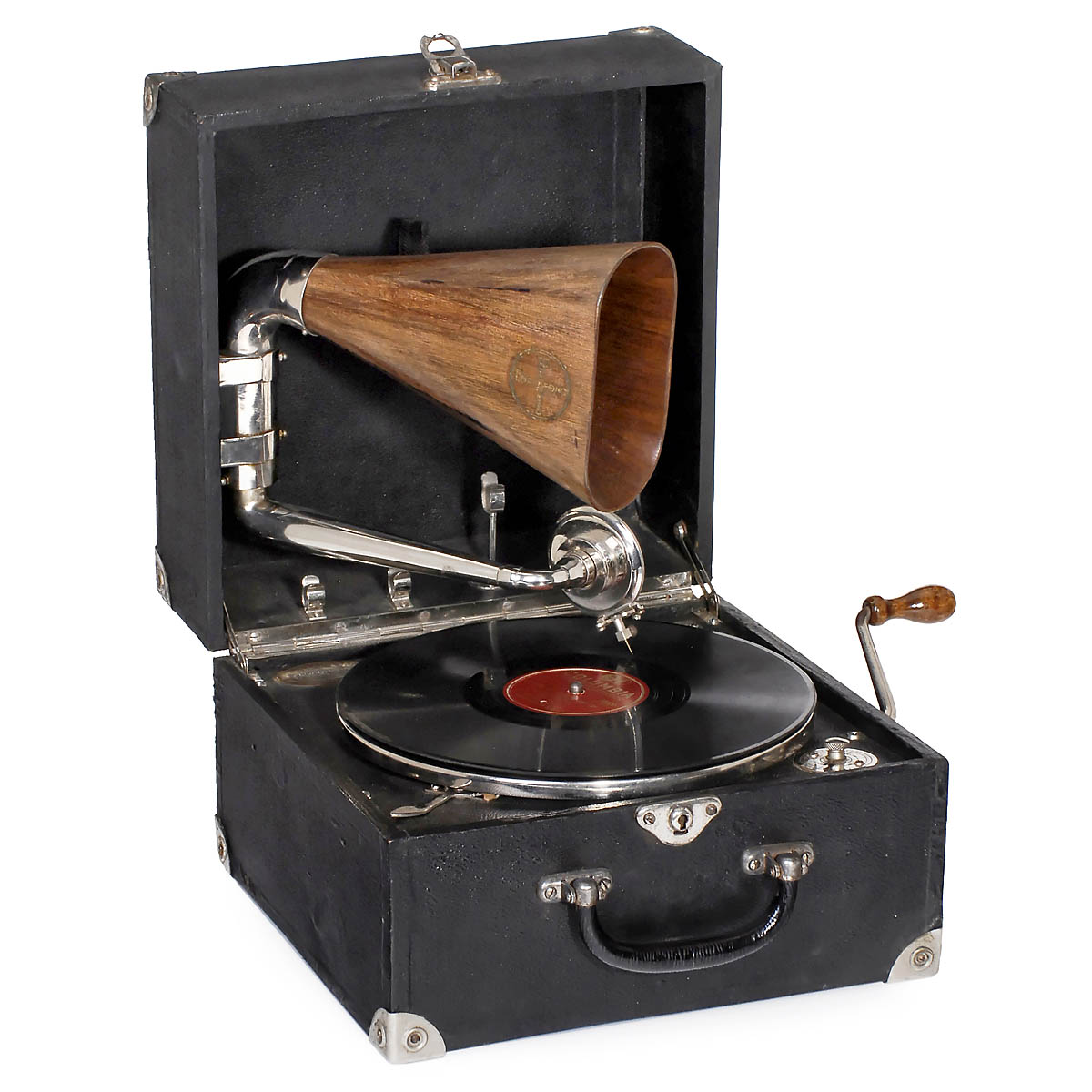 Rare portable horn gramophone, made in Spain, swiveling wood horn in lid, original Portafono reproducer, leatherette-covered case, good playing condition.