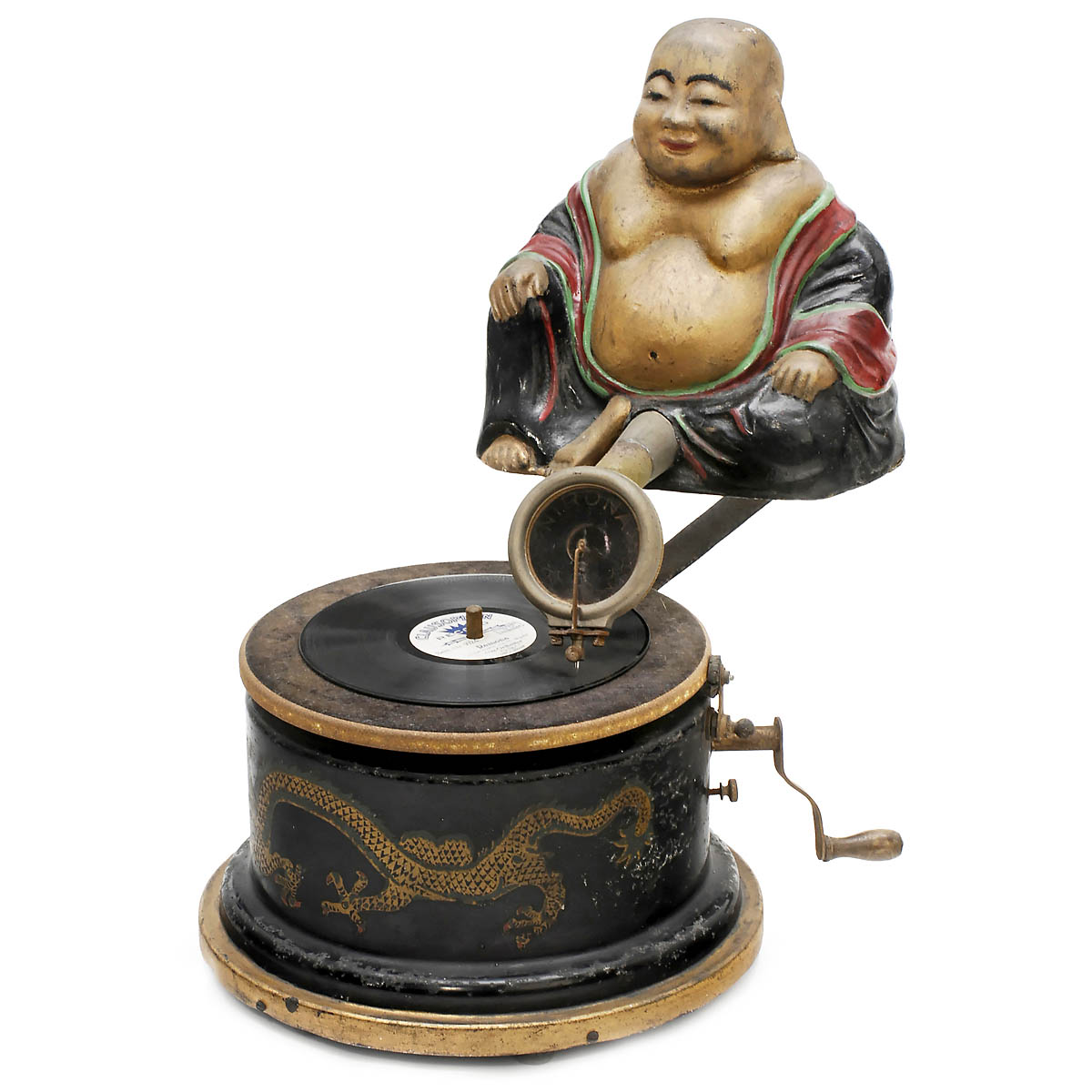 Unusual Gramophone, hand-painted papier-mâché Buddha figure as loudspeaker and resonator, Nirona soundbox, metal body with dragon motif, working condition, needs cleaning.