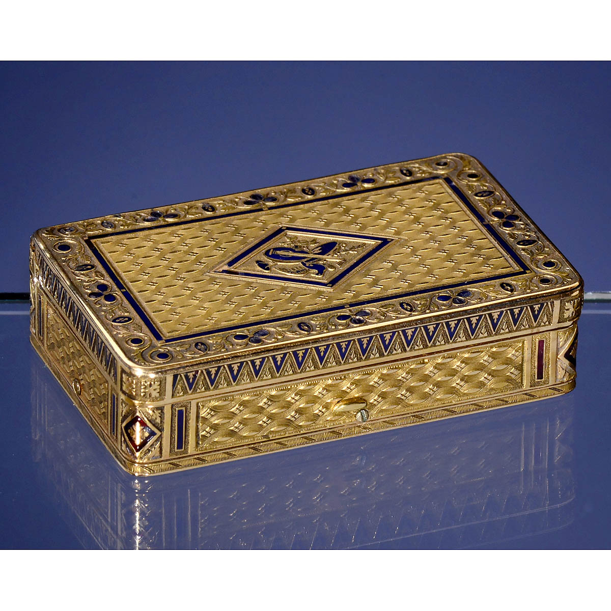 No. 4163, probably Piguet et Capt, with sur-plateau movement, male winding square and 22 teeth playing on both sides of ¾-inch diameter disc, in rose-toned gold case with engine-turned panels relieved by central motif of musical trophies and borders of enameled cobalt flowers and chased foliage on matted ground, the polished interior with stamped number "181" and indistinct maker's clover leaf mark, approx. wd. 2 ¼ x dp. 1 3/8 x ht. ½ in. (5,8 x 3,7 x 1,3 cm), with key, inner lid loose, some enamel losses and fills, movement in good playing condition. - Provenance: Collection of Luuk Goldhoorn.