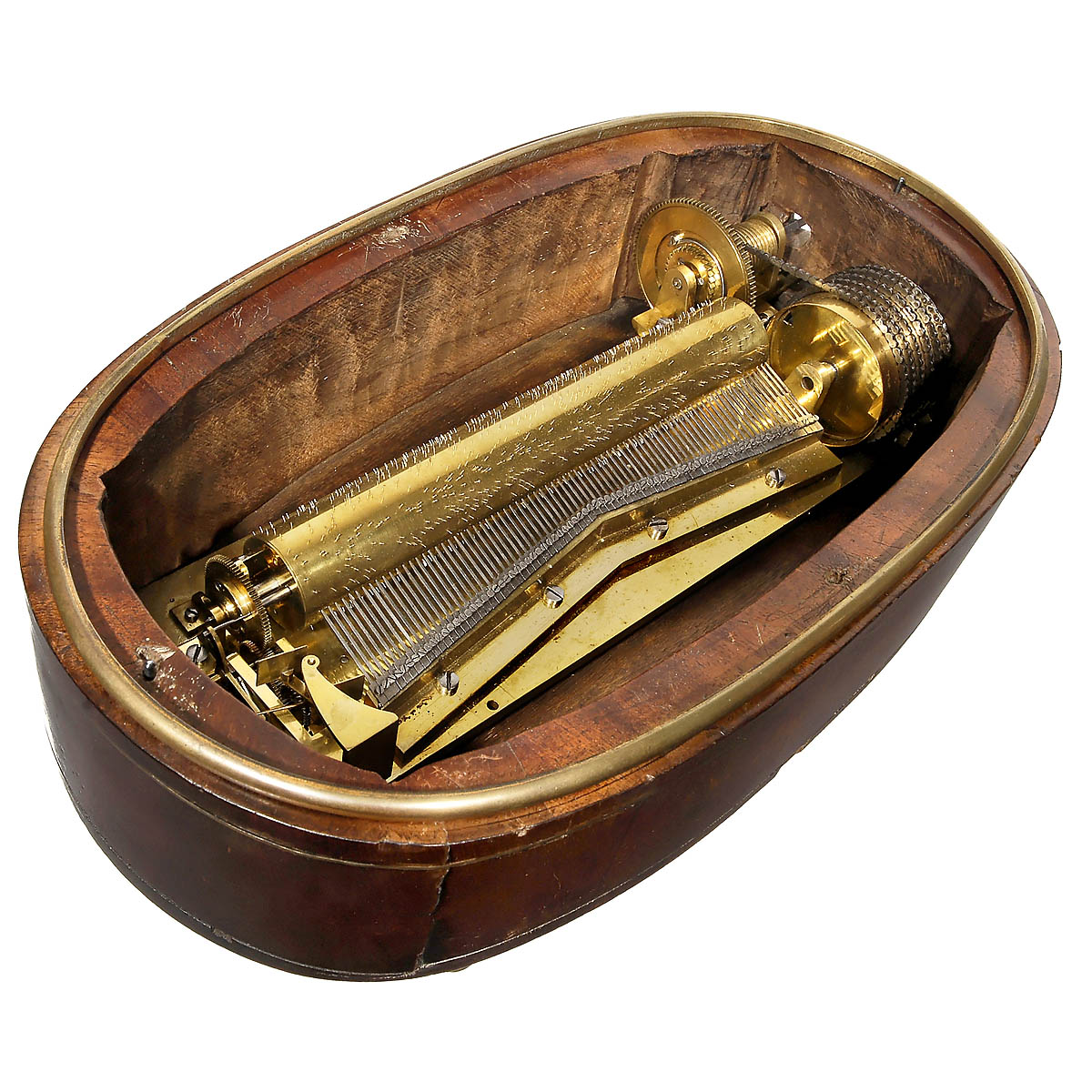 Probably Geneva, playing four airs, with 78 single teeth in chevron-shaped sectional comb (complete), bass teeth at the periphery, treble teeth in the middle, fusee spring, curved tapering governor-cock, brass bedplate, external change/repeat, stop and instant stop controls, in mahogany-veneered case with lid, brass beading and brass feet, wd. 14 ¾ in. (37,5 cm), cylinder 8 ¼ in. (21 cm), some age splits in case, movement and comb in fine fully-restored playing condition. Tunes play for around 50 seconds. A peculiarity of this movement are the three (instead of the customary two) gears in the governor train. Arthur Ord-Hume illustrates a movement with similar features in the base of a London-made clock, noting: "Three wheels mean that the endless screw is driven upwards, so the lower bearing has a steel bearing plate". - Provenance: Collection of Luuk Goldhoorn. - Literature: Eduard C. Saluz, "Klang Kunst", exhibition catalog, 1996, p. 167 for a similar movement; Arthur Ord-Hume, "The Musical Box", p. 88, plates 37-38. - An early movement with fine arrangements and a bright, delicate tone.