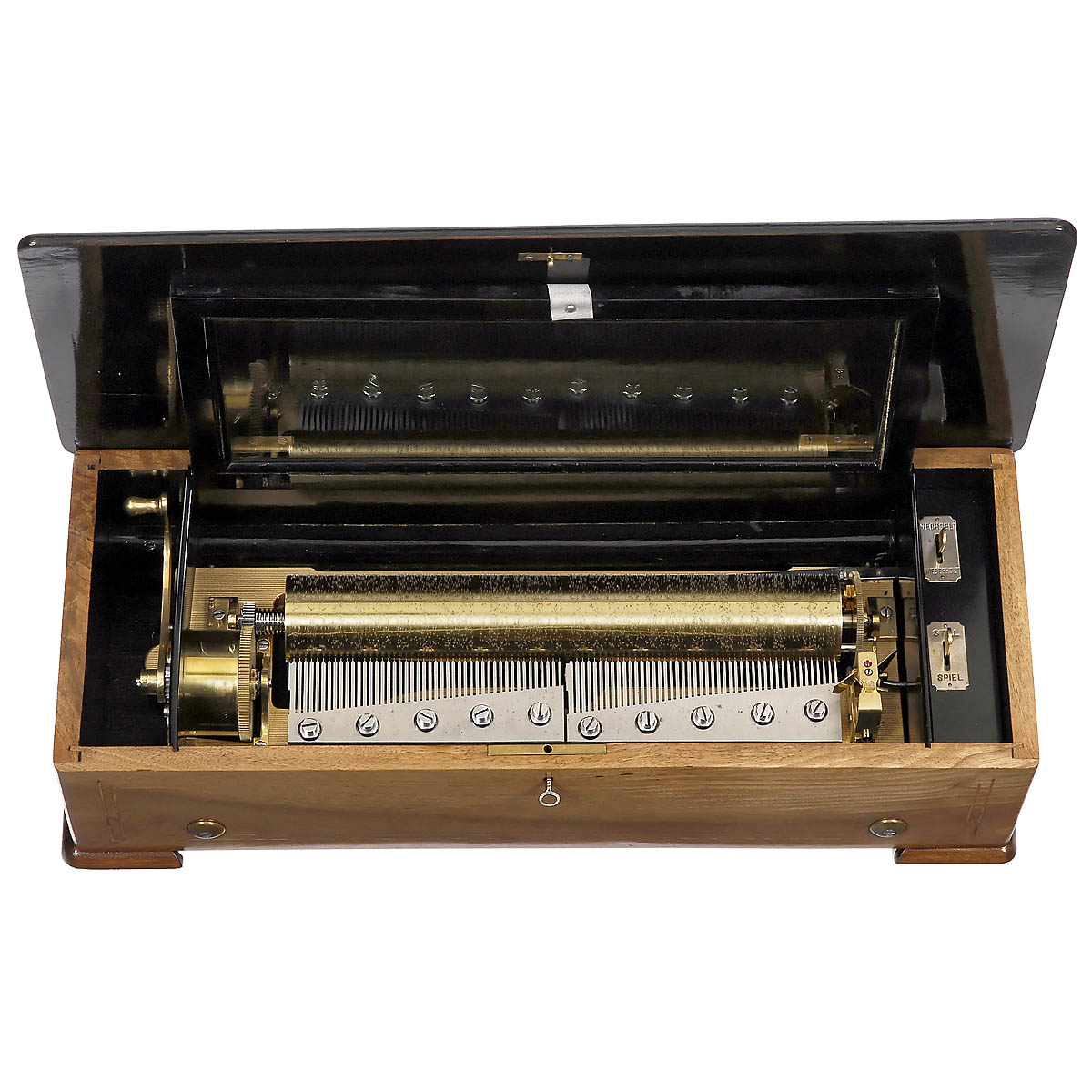 No. 11347, playing eight operatic and popular airs including the "Toreador Song" from "Carmen", "La Donna è Mobile" from "Rigoletto" and Mendelssohn's "Wedding March", with two combs of 46 teeth each (complete, approx. nine expertly replaced tips), "MF" anchor trademark and refinished walnut case with veneered and inlaid lid, wd. 22 ½ in. (57,5 cm), cylinder 13 in. (33 cm), movement in harmonious restored playing condition.