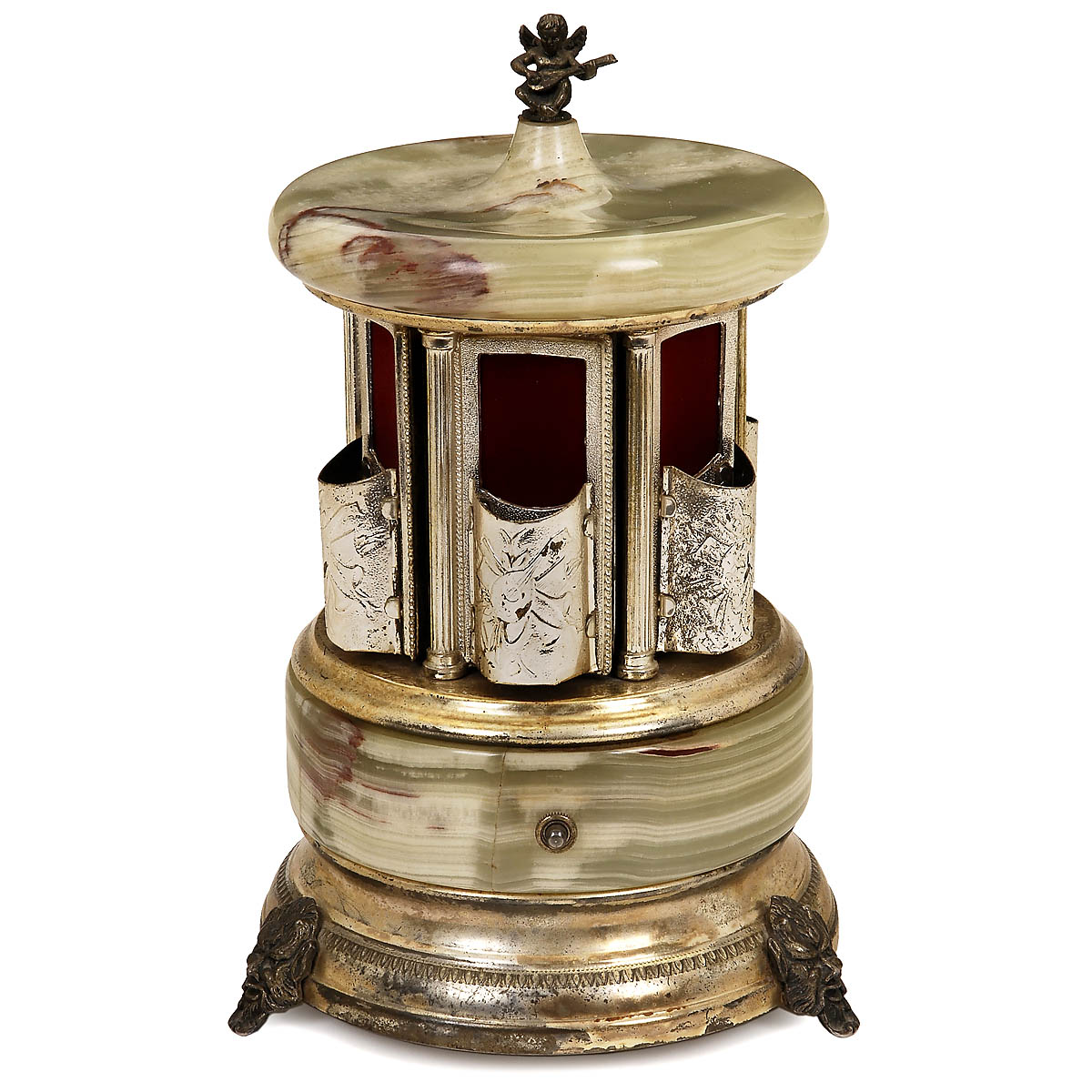 Florence, green marble and metal adorned with winged musician and satyr masks, with two-air Reuge cylinder movement ("Love Story" and "Edelweiss") that causes six compartments to open, reveal their contents and then slowly close, ht. 10 ½ in. (27 cm), split in marble, metal tarnished. - An amusing conversation piece for a musical dinner party.