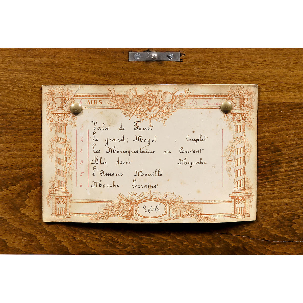 No. 92123, playing six popular airs, Gamme no. 20695, with 32 teeth in comb (missing three tips), nickel-plated cylinder, tune-indicator, tune-sheet and refinished walnut case, wd. 14 ½ in. (37 cm), cylinder 3 ½ in (9 cm), movement slow-running and in need of an overhaul.