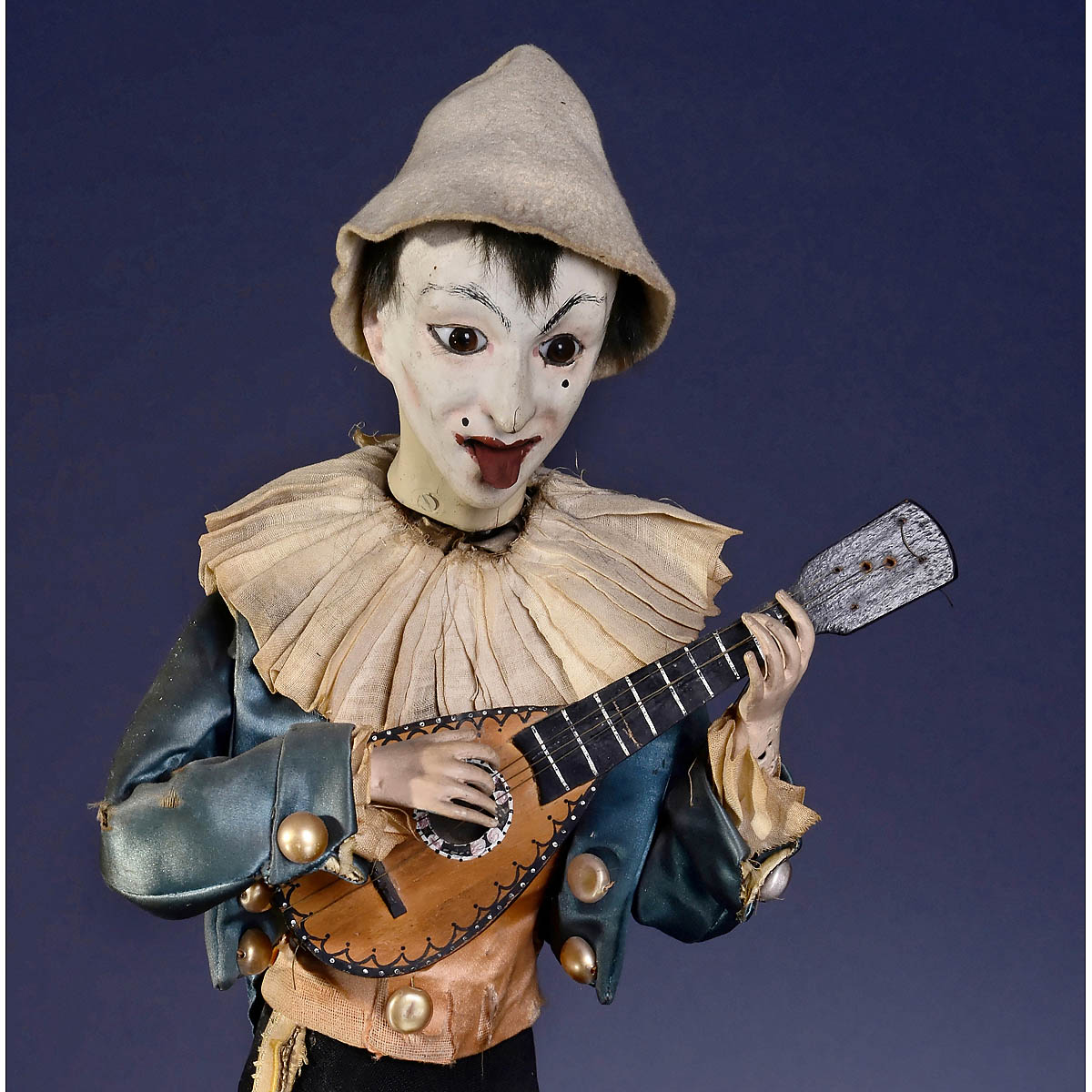 Pierrot perched on the tip of a personified papier-mâché crescent moon, with papier-mâché head, brown glass eyes, articulated tongue and metal hands, in original well-preserved blue satin tailcoat with large glass-pearl buttons, waistcoat, ruff and pointed shoes, with going-barrel motor and two-air musical movement playing a waltz and a polka, ht. 20 ½ in. (52 cm), with acorn-form stop/start, unobtrusive old retouch on Pierrot's neck and lips, clouds and moon's lips, old reinforcement on tip of moon, otherwise good. - Literature: Bailly, "Automata, the Golden Age, 1848-1914", pp. 86, 87. - The moon was a popular motif in late 19th century visual culture, inspiring métiers as diverse as advertising, the early cinema and automata. Here Pierrot is seen serenading a crescent moon with his mandolin, turning and bowing his head and sticking out his tongue as the moon rolls her eye and moves her mouth as though enchanted. - An iconic Vichy automaton in exceptionally fine original working condition.