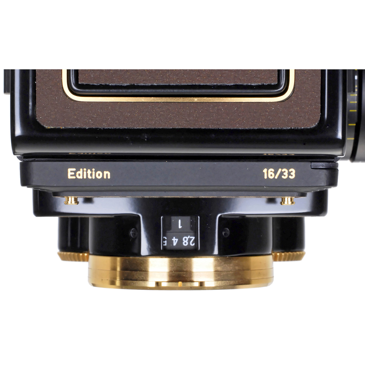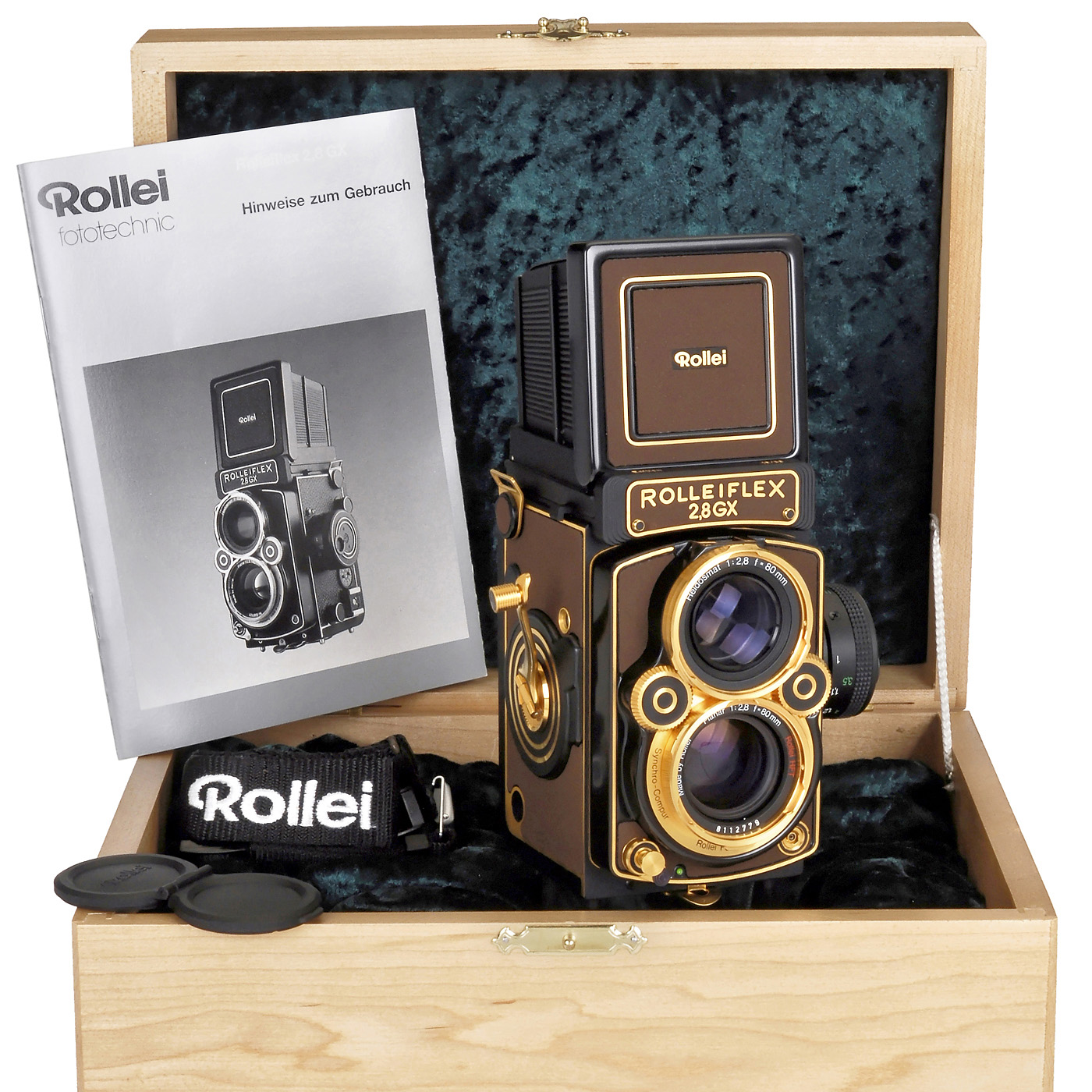 Rollei Fototechnik, Braunschweig. Limited edition, no. 16/33, only 33 cameras produced for Rollei Club! Brown buckskin. Planar 2,8/80 mm, Synchro-Compur, with original lens cap and wooden box.