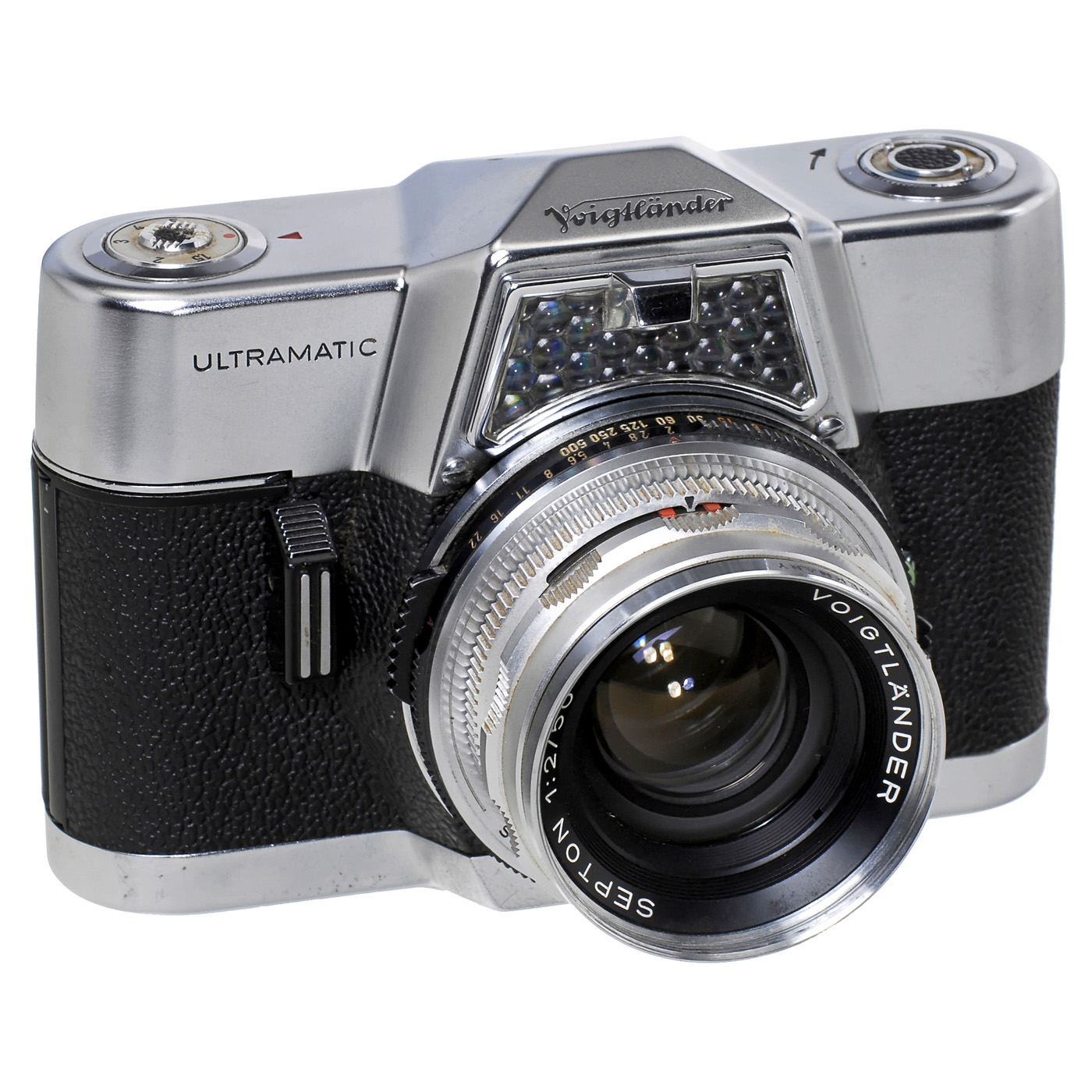 Voigtländer, Braunschweig. 1) First Ultramatic with selenium lightmeter, 1961. No. 23122, with Septon 2/50 mm, no. 6280944 in Synchro-Compur-V, lightmeter not working. (3/3-) - And: 2) Ultramatic CS, CdS lightmeter, 1965, No. 20227/5, Septon 2/50 mm no. 6256608 in Synchro-Compur-V. (2-3/2)
