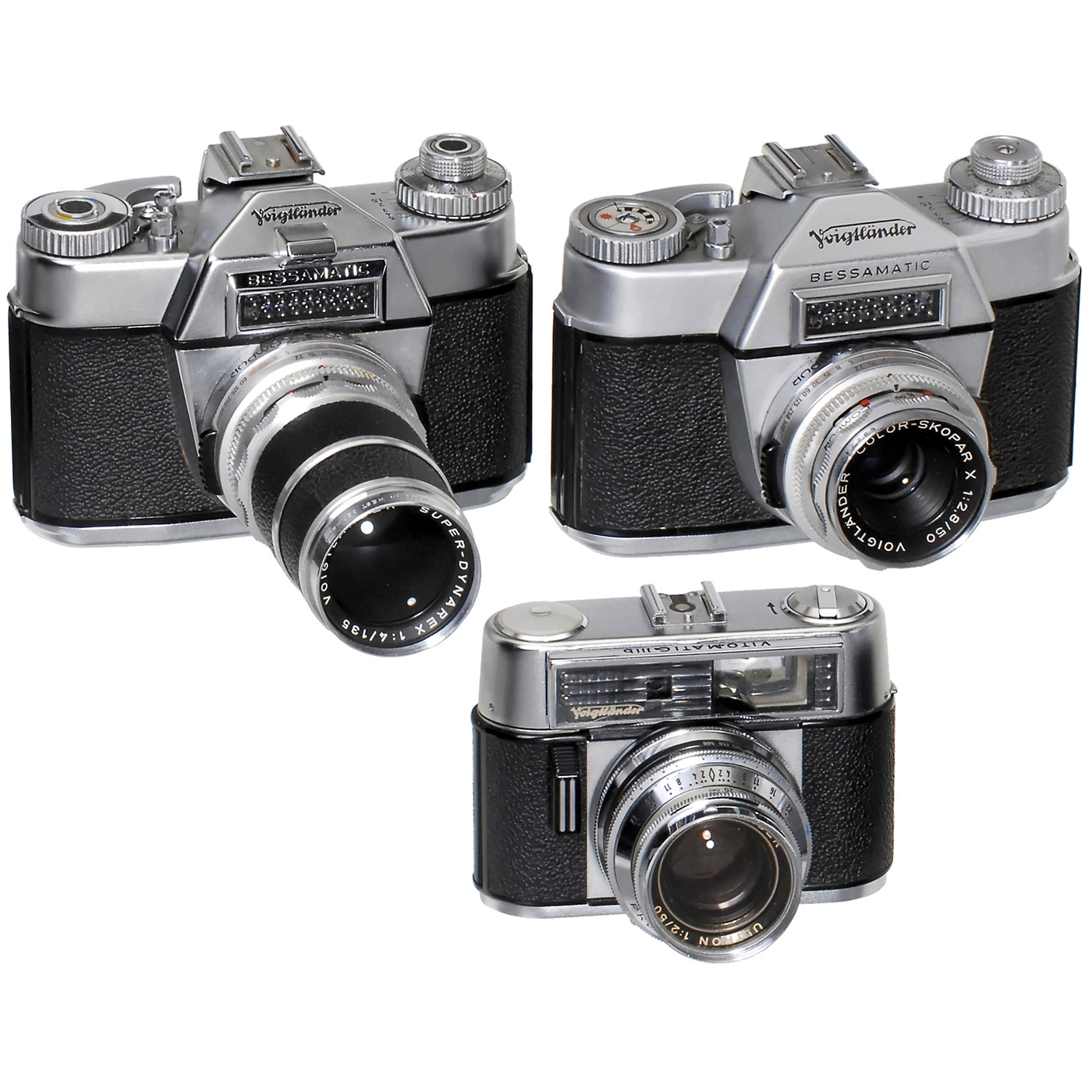 Voigtländer, Braunschweig. 1) Vitomatic IIIb, c. 1964, with Ultron 2/50 mm in Prontor 500 SLK-Y. (2/2) - 2) Bessamatic, second model, c. 1965, with Super-Dynarex 4/135 mm in Synchro-Compur. (2-/3) - And: 3) Bessamatic, c. 1962, with Color-Skopar 2,8/50 mm in Synchro-Compur. (2-/3)