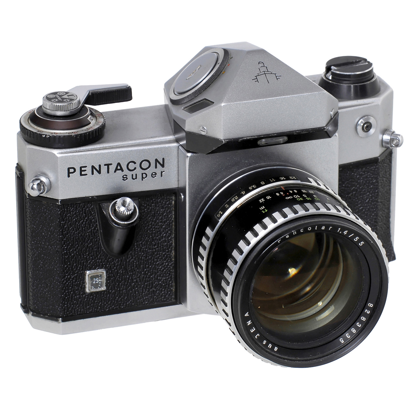 Pentacon, Dresden. Body no. 1251, Pancolar 1,4/55 mm, metal focal plane shutter 1/2000 sec. Interchangeable finders, TTL meter. High-end camera from East Germany! - Rare!
