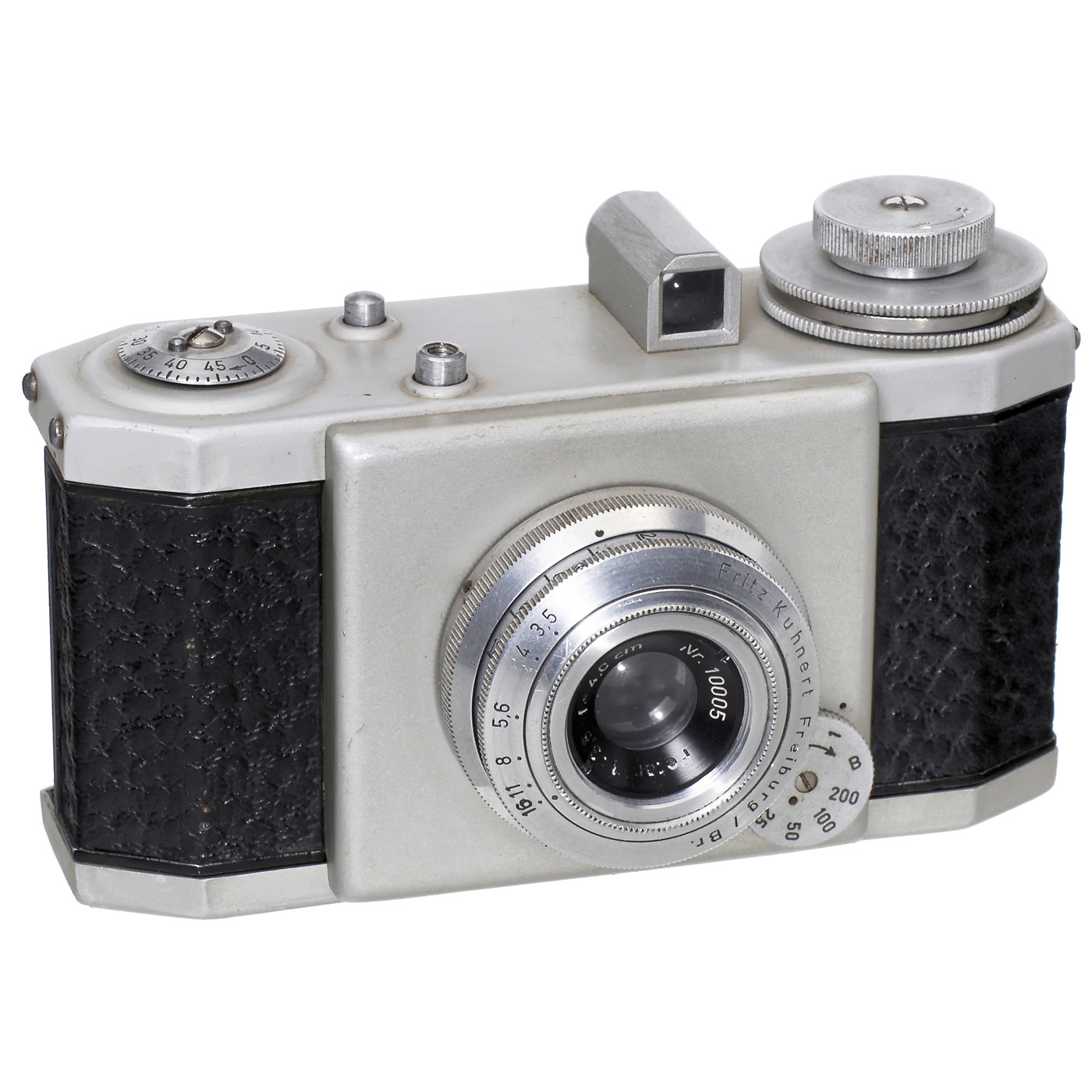 Fritz Kuhnert (later Futura-Kamerawerk GmbH) in Freiburg. Lens "Petar 3,5/4 cm" with serial no. 10005, body no. 10110, early central shutter 1-1/200 sec. (later Compur-Rapid 1/500 sec.). - Only approx. 200 cameras of this model produced. Size 24 x 24 mm on 35mm film. Special feature: retractable rapid-wind lever and interchangeable lens. - Rarity 8!