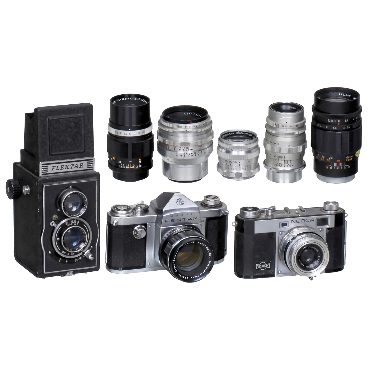 1) Welta for Peerless. Flektar TLR 6 x 6 cm, c. 1955, Pololyt 3,5/75 mm. - 2) Asahi Pentax (original), chrome, 1957, no. 143289, Super-Takumar 1,8/55 mm. - 3) Neoca Camera Ltd, Japan. Neoca 2S, 1955, Neokor 3,5/45 mm in Rectus. - Lenses: 4) Olympus Zuiko Auto-T 3,5/100 mm, with C-mount! - 5) Sun Optical, Japan. Sola 4/9 cm, with Exakta mount. - 6) Carl Zeiss Jena. Tessar 2,8/80 mm, no. 3892794, M42 screw-mount. - 7) Roeschlein. Telenar 3,8/90 mm, probably Paxette. - And: 8) Kaligar Telephoto 3,5/135 mm, M42 screw-mount. - Cameras and lenses not tested.
