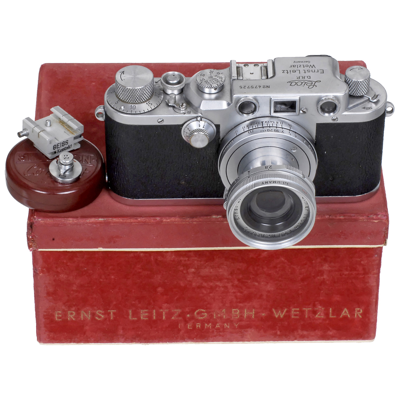 Leitz, Wetzlar. 1) Leica IIIc, no. 475725, "sharkskin" vulcanite. With body cap, case and red velvet box. (3/3) - 2) Elmar 2,8/5 cm, no. 1625772, meter scale. With UVa filter, lens cap and container. (2/2) - And: 3) Geiss Synchron-Contact for Leica IIIc.