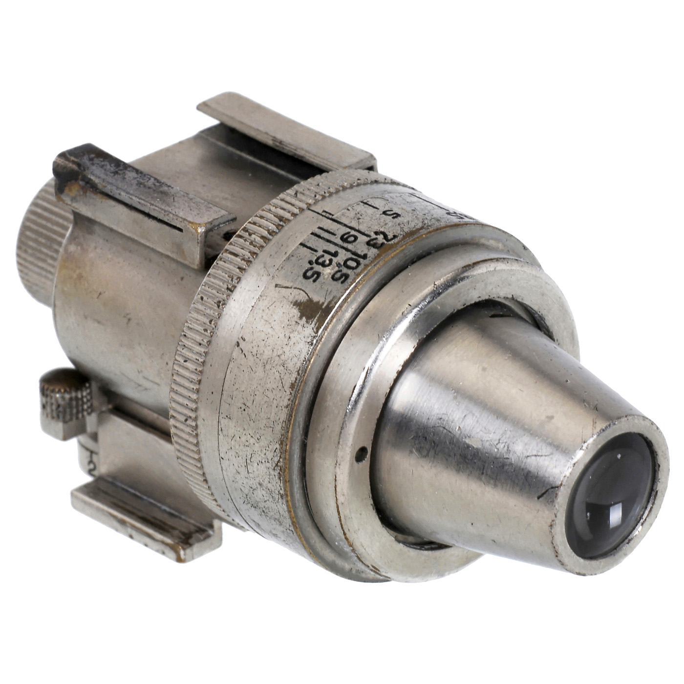 Leitz, Wetzlar. Universal viewfinder VIDOM, two-part nose, short foot. Extraordinary example with complete nickel surface (typical is black/nickel, black/chrome, chrome only). Eyepiece cracked.