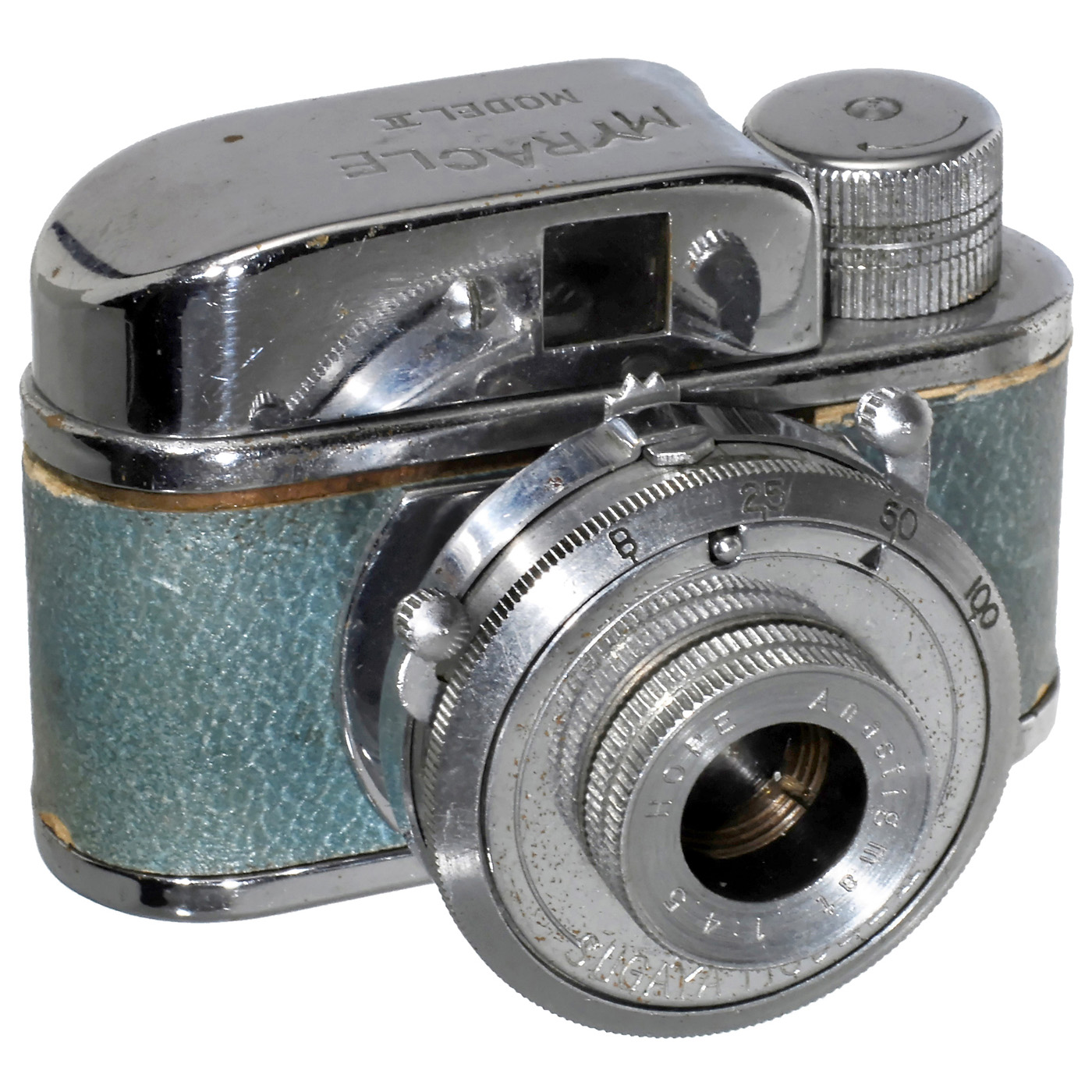 Sukaya Koki, Sukaya Optical Ltd., Japan. Blue leather covering, size 14 x 14 mm on 17,5 mm rollfilm, lens: Hope Anastigmat 4,5/25 mm, shutter 1/25-1/100 sec. "Made for Mycro Cameras Co. Inc. NY" on baseplate. - Extremely rare version!