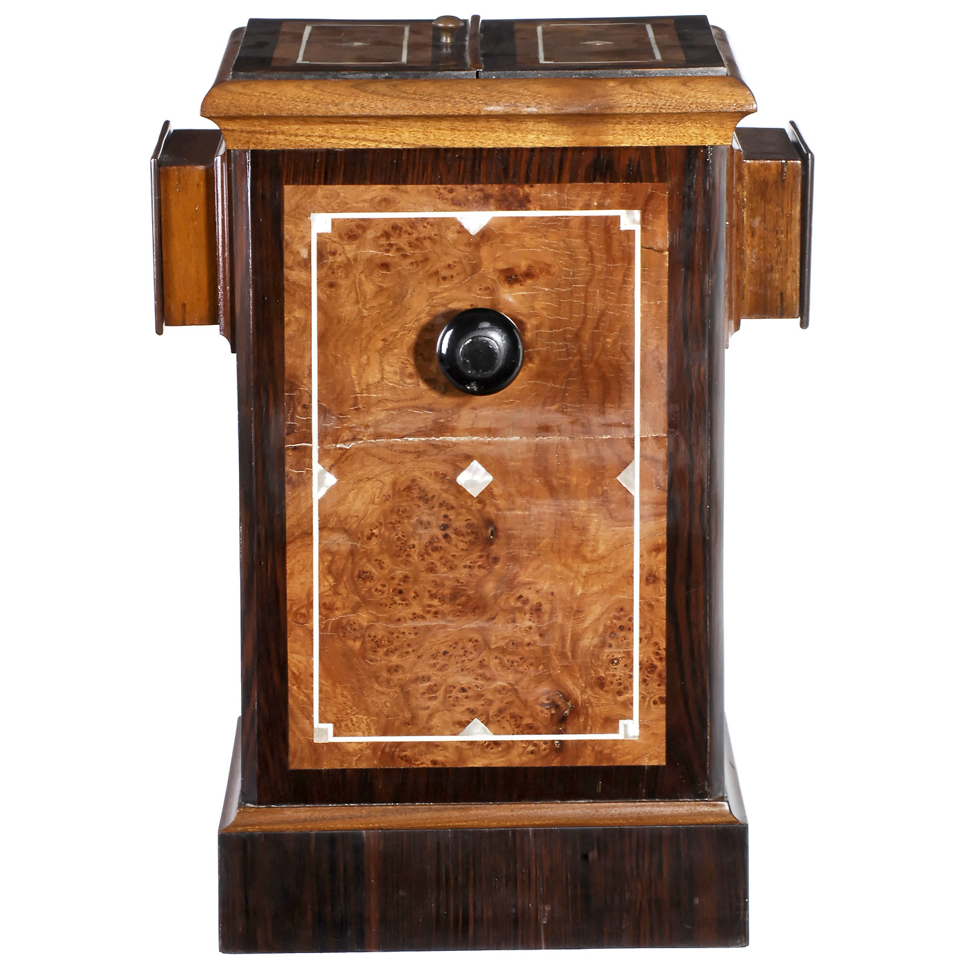 Unmarked, double viewer with prism stereo lenses for 92 stereo cards of 8,5 x 17 cm, endless-chain system, 2 sliding prism oculars, burr-wood-veneered case with inlay. Veneer split on two sides, otherwise good, height 18 in.