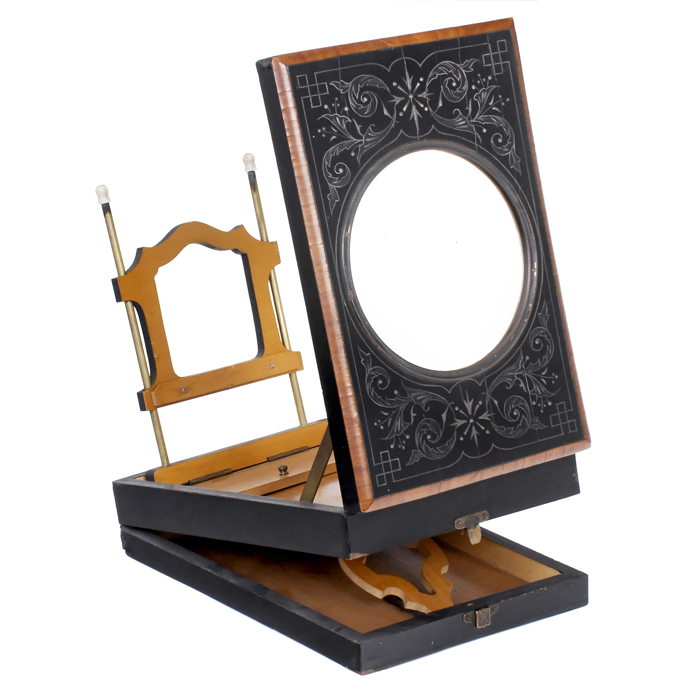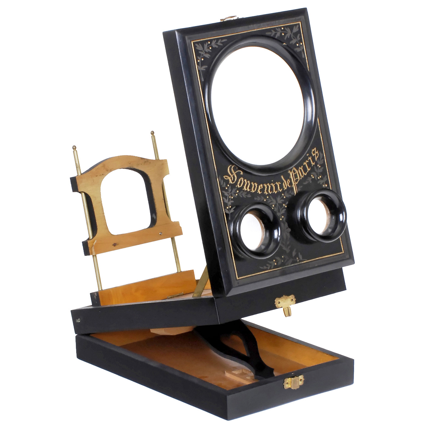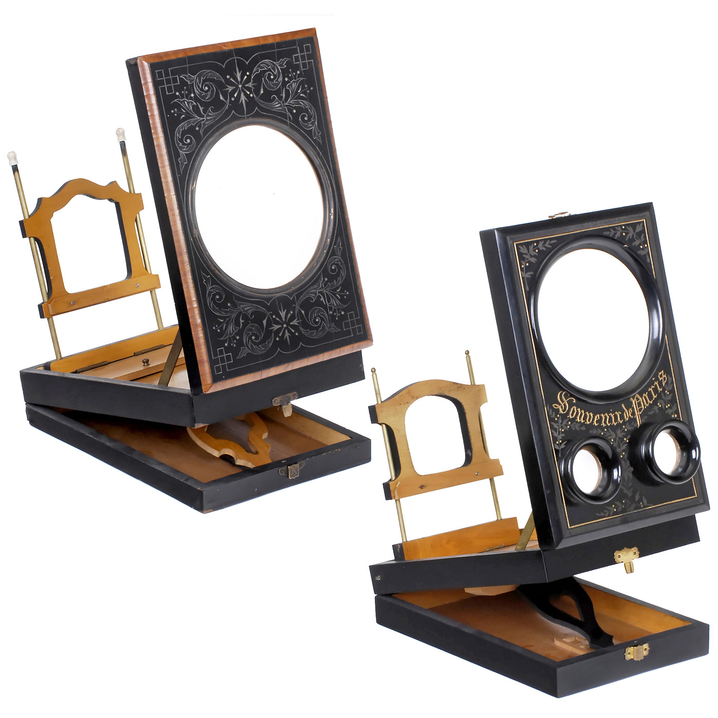 1) Stereo graphoscope, marked "Souvenir de Paris" for stereo cards of 6 x 13 cm, Cartes-de-Visite and other formats, height 14 ½ in., magnifying lens Ø 4 in. - And: 2) Graphoscope, unmarked, for photographs of up to 15 x 20 cm (6 x 7 4/5 in.), height 16 ½ in., magnifying lens Ø 4 ¾ in. - Both graphoscopes in excellent condition!