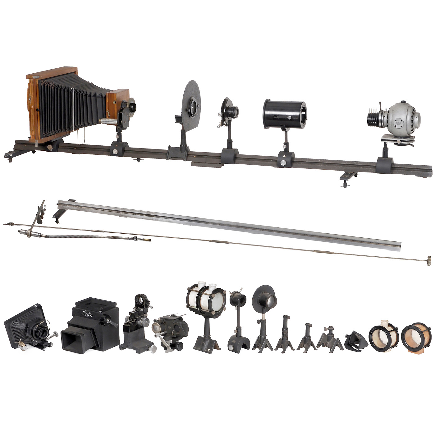 Composed of: 2 slide rails (Zeiss profile) of 2 m length each, wood plate camera, 24 x 30 cm, with focusing screen back and plate holder, metal plate camera 9 x 12 cm. - Accessories: Lamp on slider with diaphragm disc, slider with bottles, condensers, Zeiss slider, Leitz right-angle box (for 9x12cm camera), Leitz bellows I and more. - Outfit not tested for completion.