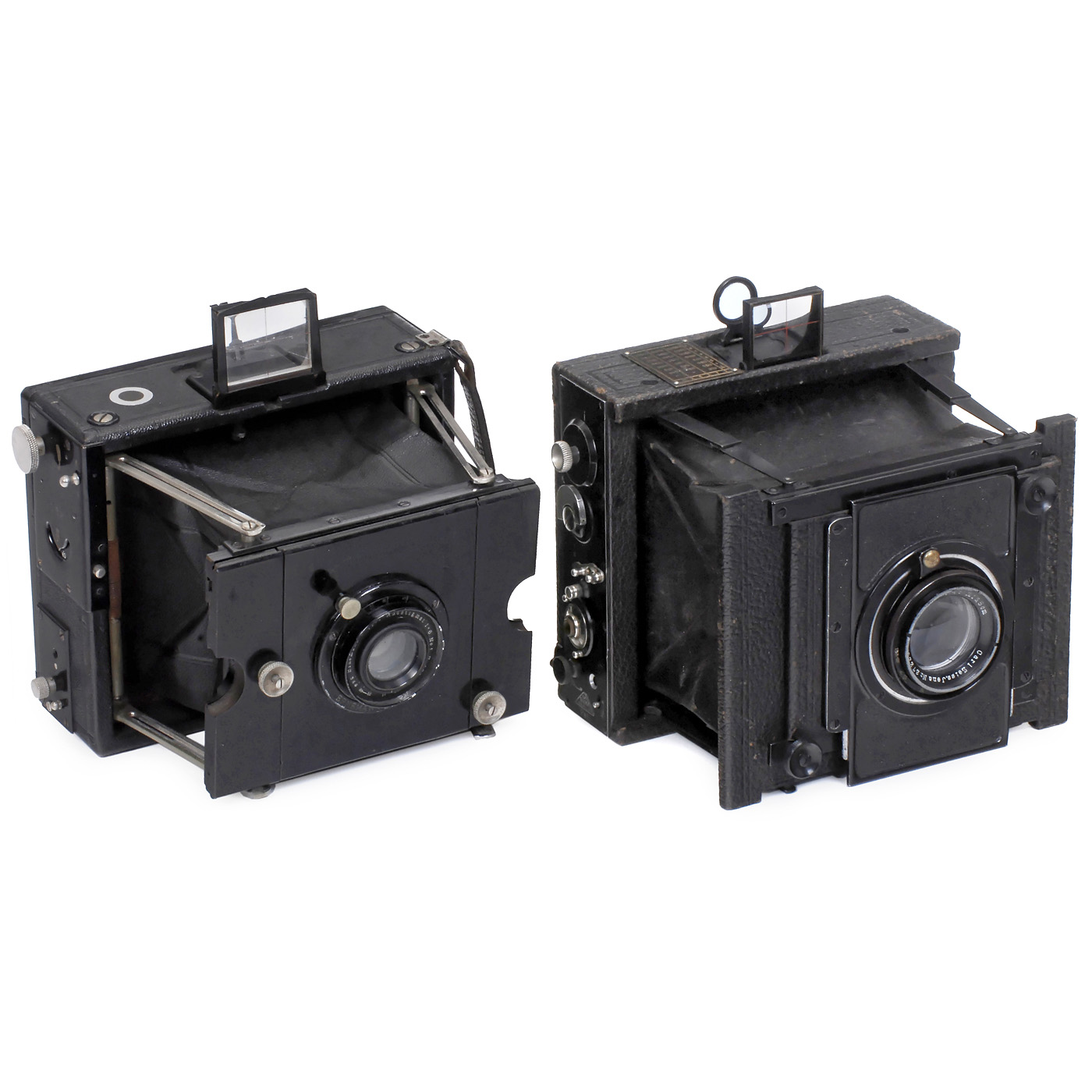 1) Ernemann, Dresden. "Klapp-Camera Mod. I", c. 1901, strut camera for plates of 9 x 12 cm, Ernemann Doppel-Anastigmat 1:6 No. 1 F=135 mm, focal plane shutter, stuck. (3/4) - And: 2) Goerz, Berlin. "Anschütz-Klappkamera 6 x 9 cm", c. 1900, body no. 41334, Tessar 4,5/13,5 cm, focal plane shutter, stuck. (3/4)