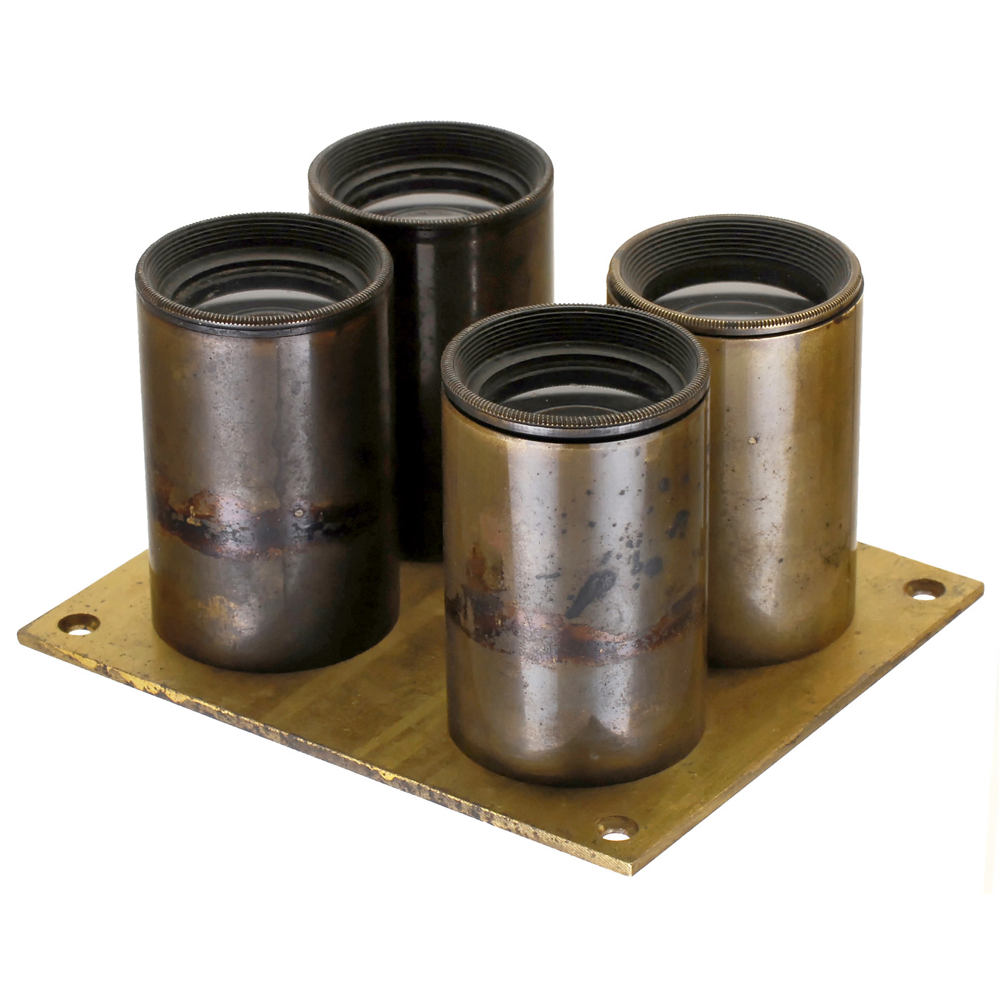 Probably Darlot, Paris, 4 brass lenses on brass board, focal length approx. 10 cm (4 in.), without focus, board size 3 ¼ x 4 ¼ in., height 2 1/3 in. - Back with handwritten script "Darlot".