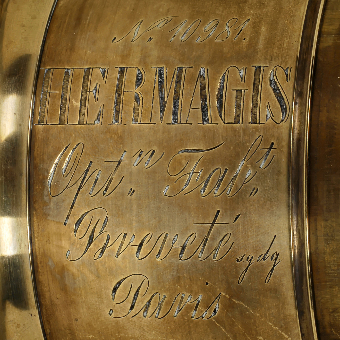Hermagis, Paris. No. 10981, approx. 40 cm focal length, semi-symmetrical construction, height with lens hood 8 ¼ in., lens element diameter approx. 2 ¾ in., lens diameter 4 1/3 in., rack-and-pinion focusing. - Very rare Hermagis lens in excellent original condition, with clean optics!