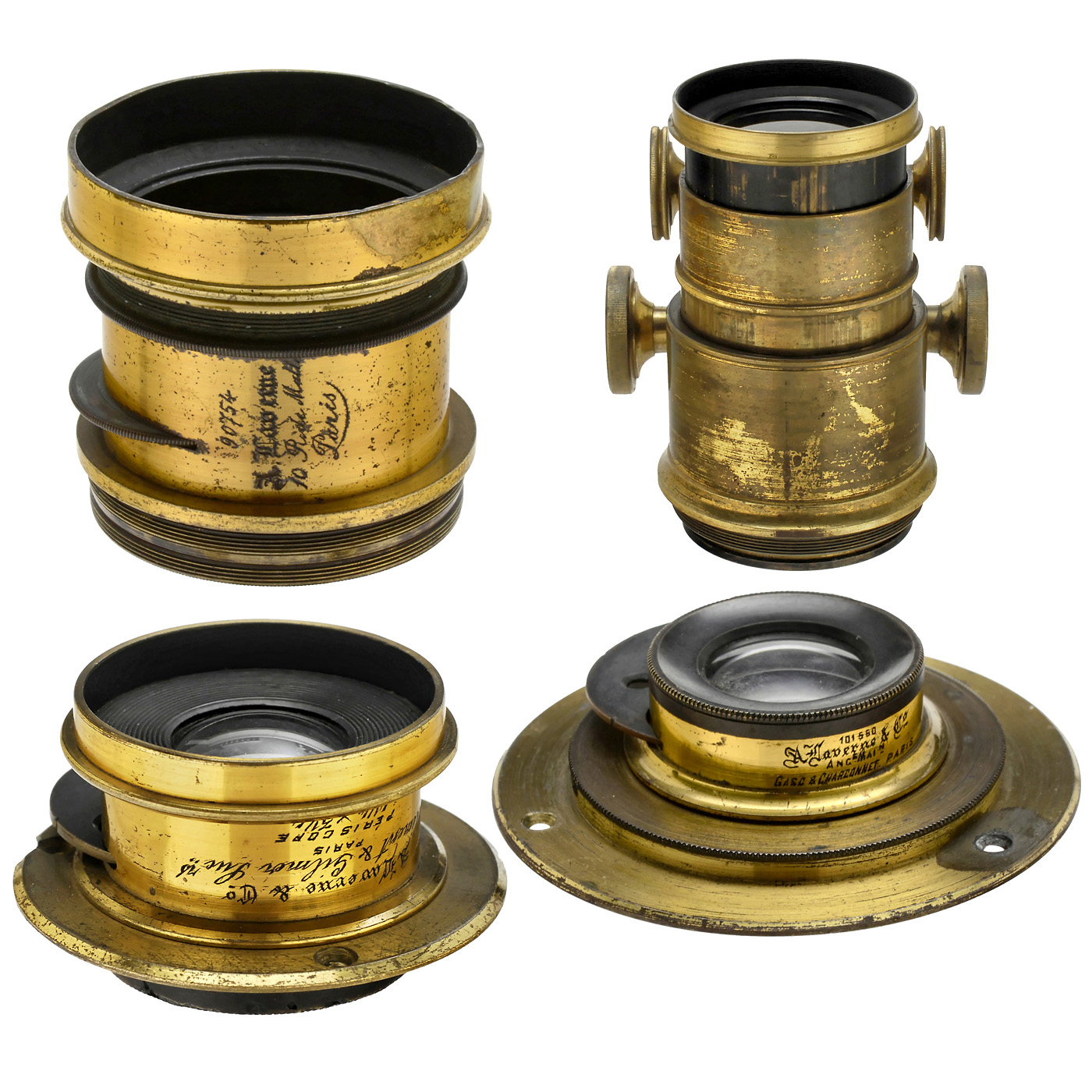 1) "A. Laverne & Co., Clément & Gilmer Sucrs Paris". Wide-angle "Periscope 4 ¼ x 3 ¼", c. 1887, approx. 8 cm focal length, lens Ø 2/3 in., height 1 1/5 in., connecting ring Ø 1 2/3 in., rotating stop. (2/2) - 2-3) 2 wide-angle lenses by Laverne & Co. (Gasc & Charconnet), c. 1887-1890. Wide-angle lens, no. 101550, rotating stop, height ¾ in., Ø 1 3/5 in., connecting ring Ø 2 ½ in. - Wide-angle lens, no. 90754, with approx. 17 cm focal length, rotating stop, height 2 1/3 in., Ø 2 1/3 in. (2-3/2-3) - And: 4) Caterpillar projection lens, c. 1899, unmarked, engravings: 12, 15, 18, 20 and on the brass rims 9 and 12, rack-and-pinion focusing, height 5 ½ in., screw-mount Ø approx. 2 2/3 in. (3/3)