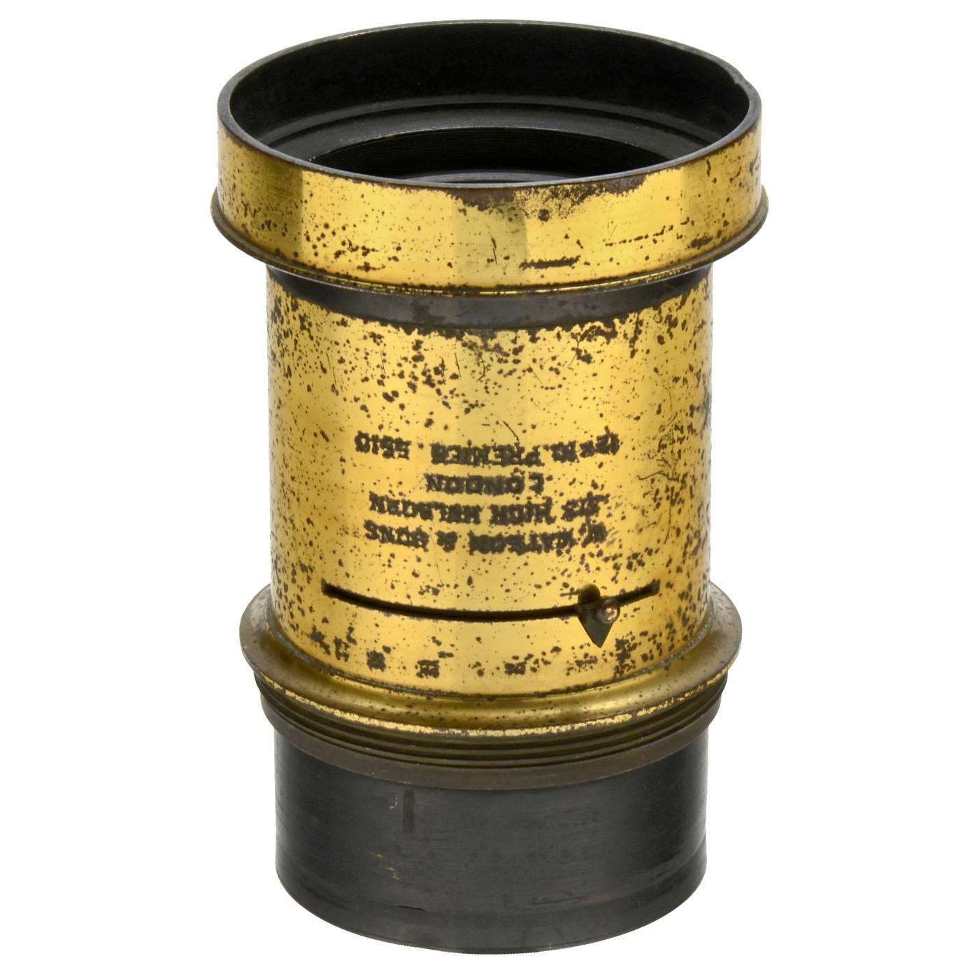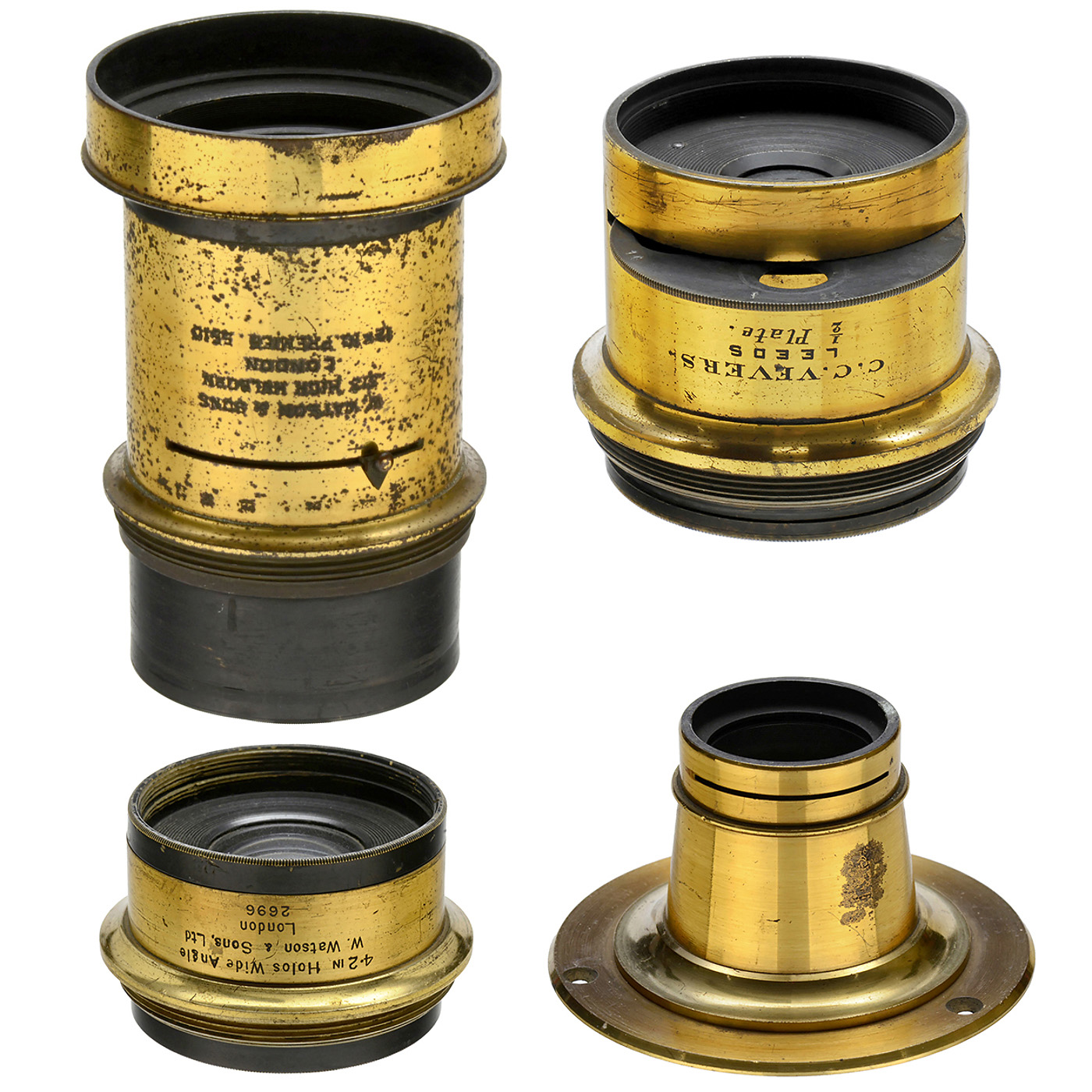 1) Watson & Sons. "12 x 10 Premier", c. 1875, no. 5510, probably an aplanatic lens, iris stop (stuck), approx. 45 cm focal length, height approx. 6 in., lens diameter approx. 2 ¾ in., light dent in rear lens mount. (3/4) - 2) Early landscape lens from England, c. 1865, unmarked, approx. 12 cm focal length, for 6 x 9 cm cameras, for waterhouse stop, with slot on front, height 2 in., Ø 2 in., connecting ring Ø 2 ¾ in. (2/2) - 3) Charles Cheetham Vevers. "C.C. Vevers Leeds ½ Plate", c. 1900, lens with focal length of approx. 25 cm, rotating stop, height 2 in., Ø 2 in. (3+/3+) - And: 4) Watson & Sons. "4.2 in Holos Wide Angle", convertible lens, c. 1910, no. 2696, front lens with engraving "Front 8 in", back lens with "Back 6 ¾ in", thus the lens could provide 3 different focal lengths: 4,2, 6 ¾ and 8 in. With iris diaphragm and 2 aperture scales, height 32 mm. (3+/2-3)